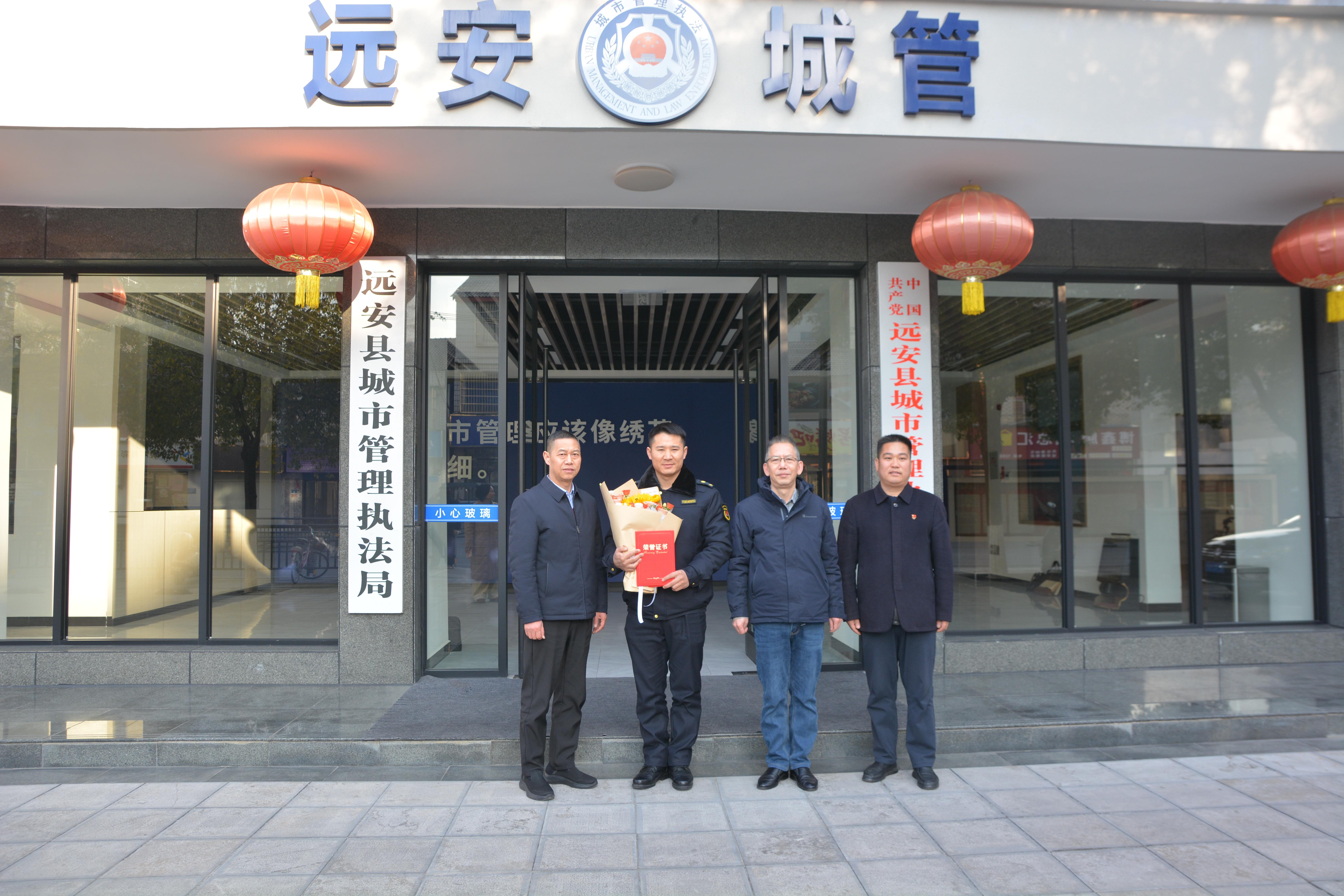 远安融媒讯(通讯员晁若桐)1月9日上午,远安县委政法委、县退役军人事务局相关负责人专程来到县城管局,为执法队员唐向军颁发“见义勇为表扬证书”并送上鲜花与慰问金,表扬其勇救落水群众的英勇事迹。