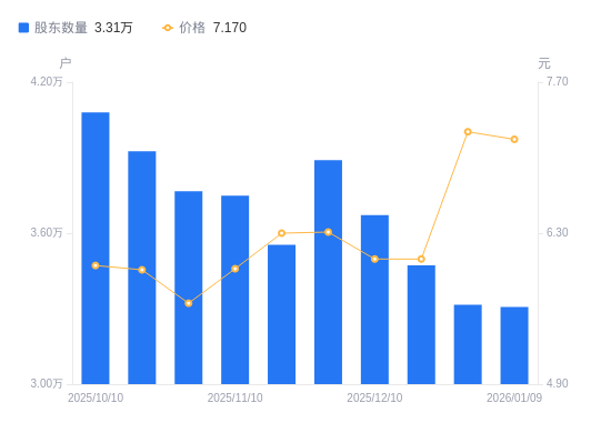 日期A股户数(户)流通A股户均持股数(股)户均持股市值(万元)2026-01-093306818505.1213.272025-12-313315718455.4513.362025-12-193471917625.1410.682025-12-103671216668.3210.102025-11-283890315729.579.932025-11-203554117217.5010.852025-11-103748516324.599.752025-10-313766116248.309.182025-10-203925115590.119.292025-10-104080314997.129.00