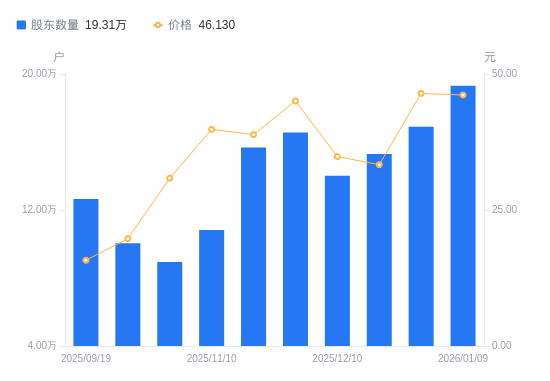 日期A股户数(户)流通A股户均持股数(股)户均持股市值(万元)2026-01-091930802594.4811.972025-12-311690232963.7513.762025-12-191528803276.7010.922025-12-101401823573.5112.452025-11-281655373026.1613.632025-11-201567983194.8212.422025-11-101081994629.8218.442025-10-31893605605.8917.292025-09-301004214988.429.842025-09-191264033963.066.25
