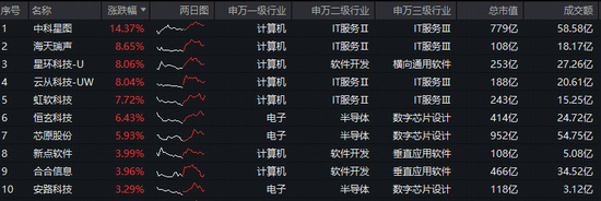 成份股方面,中科星图领涨超14%,海天瑞声、星环科技、云从科技涨逾8%,虹软科技、恒玄科技等个股大幅跟涨。权重股方面,芯原股份涨超6%,澜起科技涨超2%,寒武纪涨逾1%。