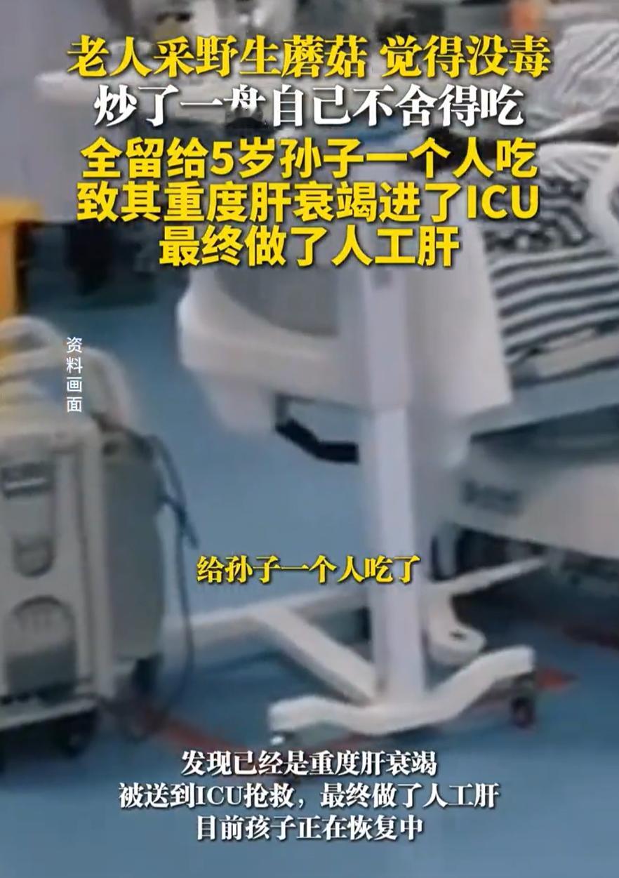 这爷爷奶奶会愧疚死吧!河南郑州,一名5岁男孩放假回老家,爷爷奶奶看到孙子后喜欢的不得了,带着他采野生蘑菇,两位老人凭经验觉得没毒,又不舍得吃,做好了一盘全都给孙子吃了,结果孙子重度肝衰竭进了ICU 据悉,孩子从城里回老家,爷爷奶奶盼了这么久,终于把孙子盼回来了。老两口高兴得不知道怎么办才好,恨不得把所有的好东西都捧到孩子面前 因为乡下没什么高科技东西,爷爷奶奶就带着他上山采蘑菇,其中看到野蘑菇,样子看着熟悉,和以前吃过的那种差不多。凭着一辈子的生活经验,他们觉得这蘑菇没问题,是个新鲜玩意儿,就采了些回家 炒菜的时候,香气飘出来,两位老人自己一口没舍得吃,全盛在盘子里,笑眯眯地看着孙子吃下去。他们心里想的,大概就是最简单的疼爱:好东西,得留给娃 可谁能想到,就是这一盘充满疼爱的菜,差点要了孩子的命。吃完不到半天,孩子开始喊肚子疼,家里人才发觉不对劲,赶紧往医院送。结果一查,是毒蘑菇中毒,已经引发了重度肝衰竭,直接进了重症监护室 其实类似的事情,几乎每年都在发生。尤其是夏天雨季过后,野蘑菇长得旺盛,很多老一辈人,或者自认为有经验的人,都会按记忆里的“土方法”去辨认。觉得颜色不艳的就没毒,或者认为以前吃过一样的就安全。但蘑菇的种类太多了,很多有毒的和无毒的长得极其相似,连专家都要谨慎辨别,光凭经验肉眼判断,风险非常大 很多人看完会心疼孩子,也会替爷爷奶奶难受。这种心疼不该停留在唏嘘上,更该变成提醒。疼孩子这件事,光靠心是不够的,还得有边界和常识