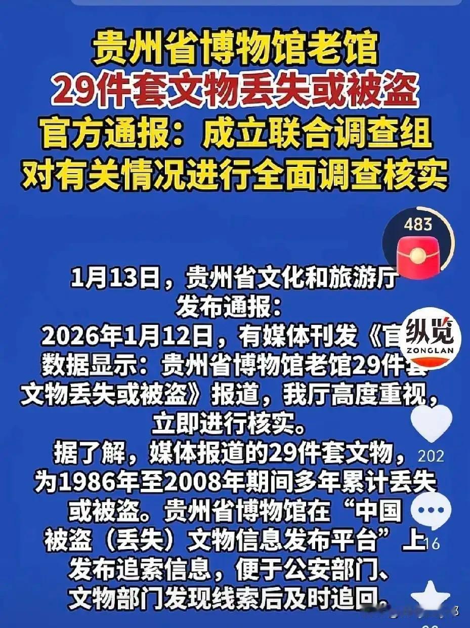 看来南博只是冰山一角啊! 贵州省博物馆被曝出, 从1986年到2008年的22年间,出现29件文物丢失或被盗,平均一年就少一件。 现在贵州文旅厅已经开始介入调查。 要不是南博先出事,贵博这事儿估计不会被人关注。 八十年代,出现文物被盗还能理解; 到二十一世纪,还会出现文物丢失就不敢相信了, 毕竟监控、门禁、人脸识别,各种防偷防盗的技术都成熟了。 如果真是被外人偷或被盗,相信一定能找到作案的人。 就怕跟南博一样,是内部人员在监守自盗,这就不是偷盗这么简单了。 出了个南博,又来一个贵州省博, 看来国家真有必要对各大博物馆来一次大检查了, 看看全国到底有多少老鼠在挖自家的墙角。