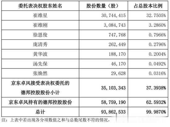 标的股份交割完成后,京东卓风持有德邦控股58,759,190股股份(占德邦控股总股本的62.5932%),通过接受表决权委托而拥有表决权的德邦控股股份为35,103,343股(占德邦控股总股本的37.3938%),京东卓风拥有表决权的前述德邦控股股份合计为93,862,533股(占德邦控股总股本的99.987%)。