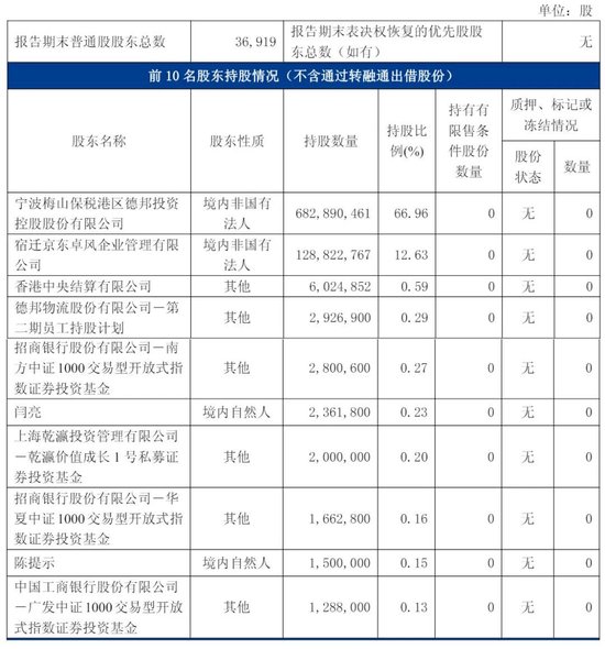 截至2025年9月30日,宁波梅山保税港区德邦投资控股股份有限公司持股为66.96%,宿迁京东卓风企业管理有限公司持股为12.63%,香港中央结算有限公司持股为0.59%,德邦物流股份有限公司-第二期员工持股计划持股为0.29%,招商银行股份有限公司-南方中证1000交易型开放式指数证券投资基金持股为0.27%。