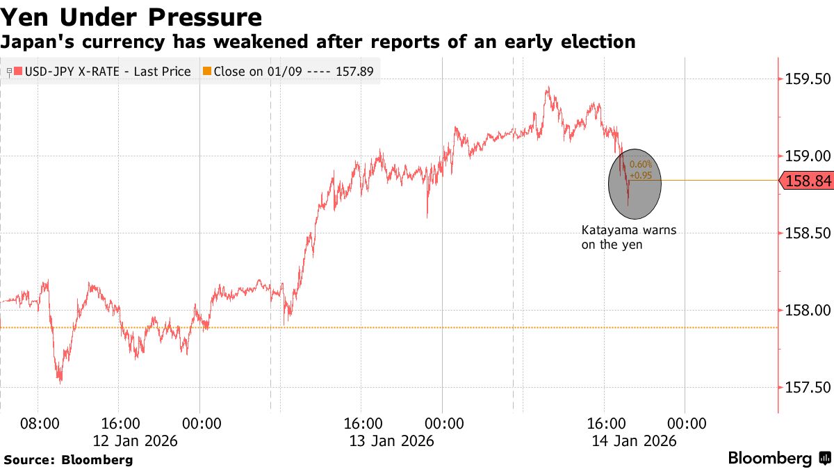 在有关日本首相高市早苗可能提前举行大选的消息传出后,日元近日持续下跌,周三早些时候一度跌至1美元兑159.45日元,创2024年7月以来的最低水平。不过,日本财务大臣及日本最高外汇事务官员周三均对投机者发出最新警告,推动日元小幅回升。截至发稿,美元兑日元汇率跌0.31%,报158.61。