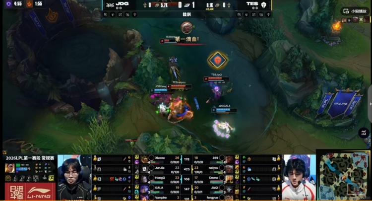 [3:08]Junjia墨菲特河道被Fengyue芮尔强开,naiyou安蓓萨拿下一血,但是随后TES下路组想从河道直接回,结果凯旋GALA芸阿娜回血反打,Fengyue芮尔闪现撞墙!这波最终是JDG下路组各自拿到一个击杀,JDG打出1换2!