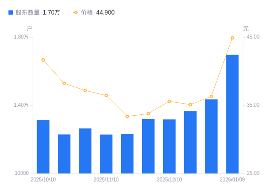 日期A股户数(户)流通A股户均持股数(股)户均持股市值(万元)2026-01-09169645118.3422.982025-12-31143466052.3921.982025-12-19136546359.1322.312025-12-10131696593.3323.462025-11-28132096573.3622.202025-11-20123267044.2623.492025-11-10122837068.9225.762025-10-31126386870.3625.542025-10-20122867067.1927.012025-10-10131406607.8827.54