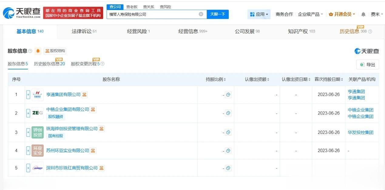 股东信息显示,该公司由亨通集团有限公司、中植企业集团有限公司、珠海铧创投资管理有限公司、苏州环亚实业有限公司、深圳市珍珠红商贸有限公司共同持股。