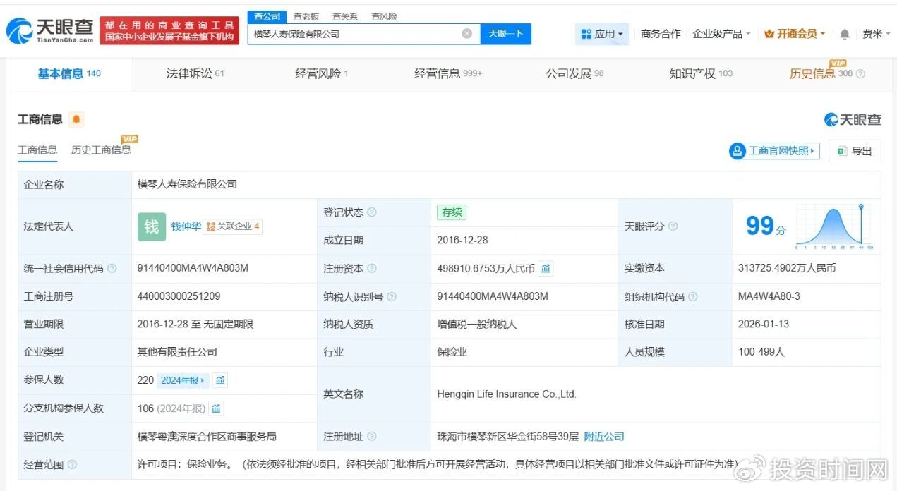 天眼查工商信息显示,近日,横琴人寿保险有限公司发生工商变更,注册资本由约31.4亿人民币增至约49.9亿人民币,增幅约59%。