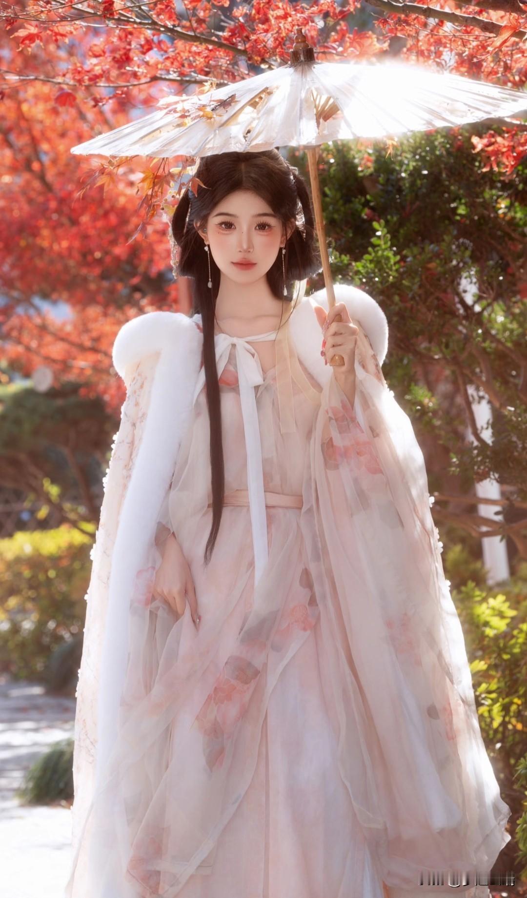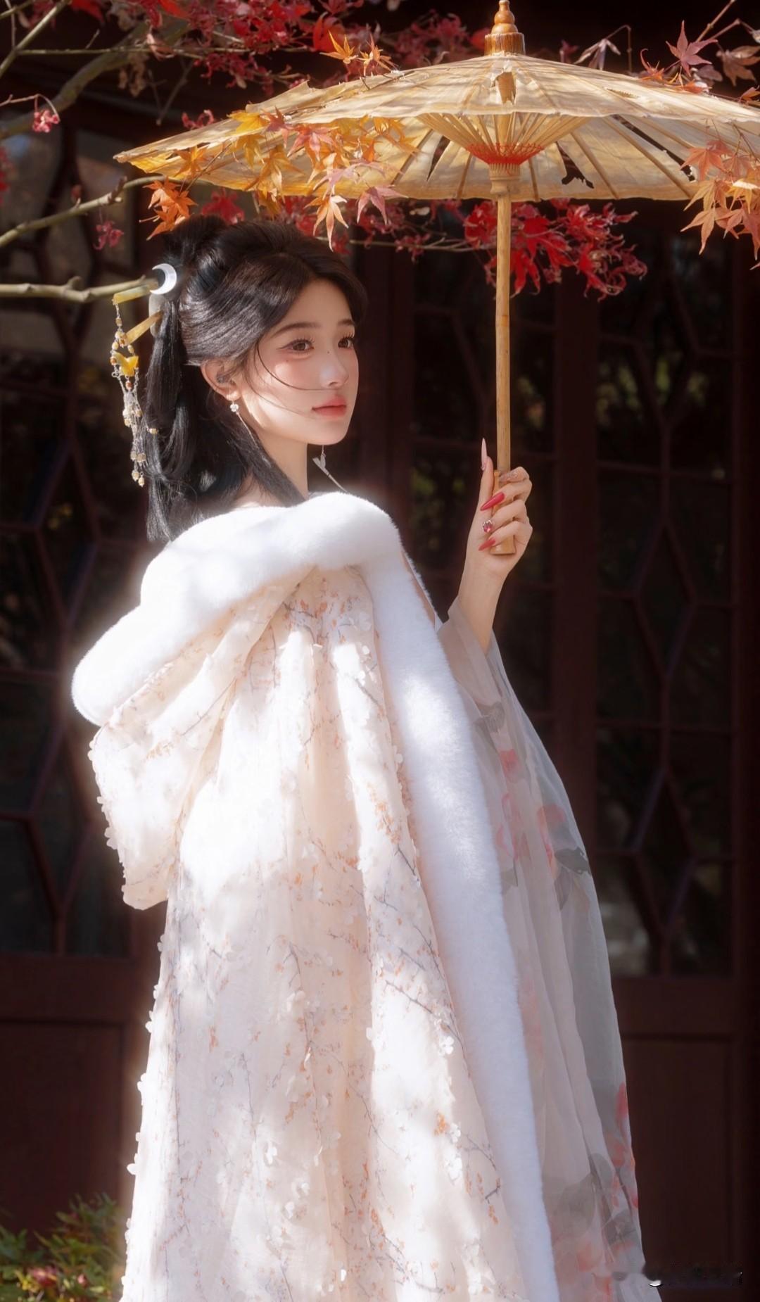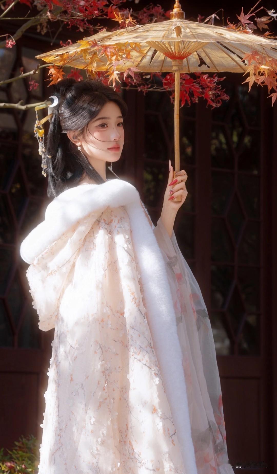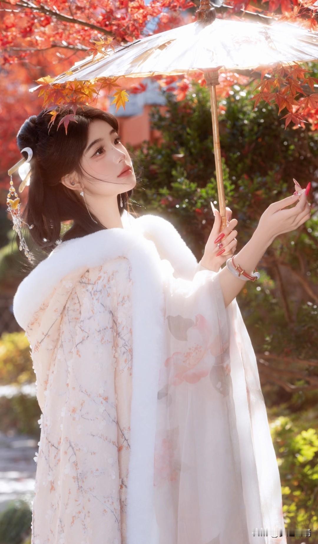 秋日仙子,红叶间轻舞,白衣飘飘,花枝相伴。