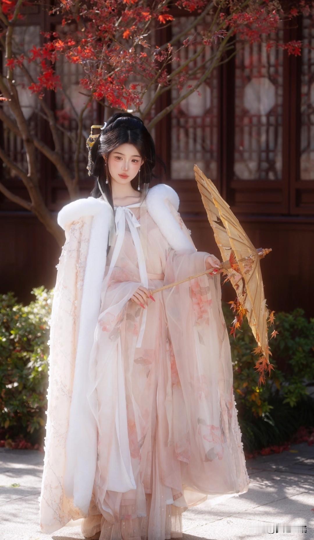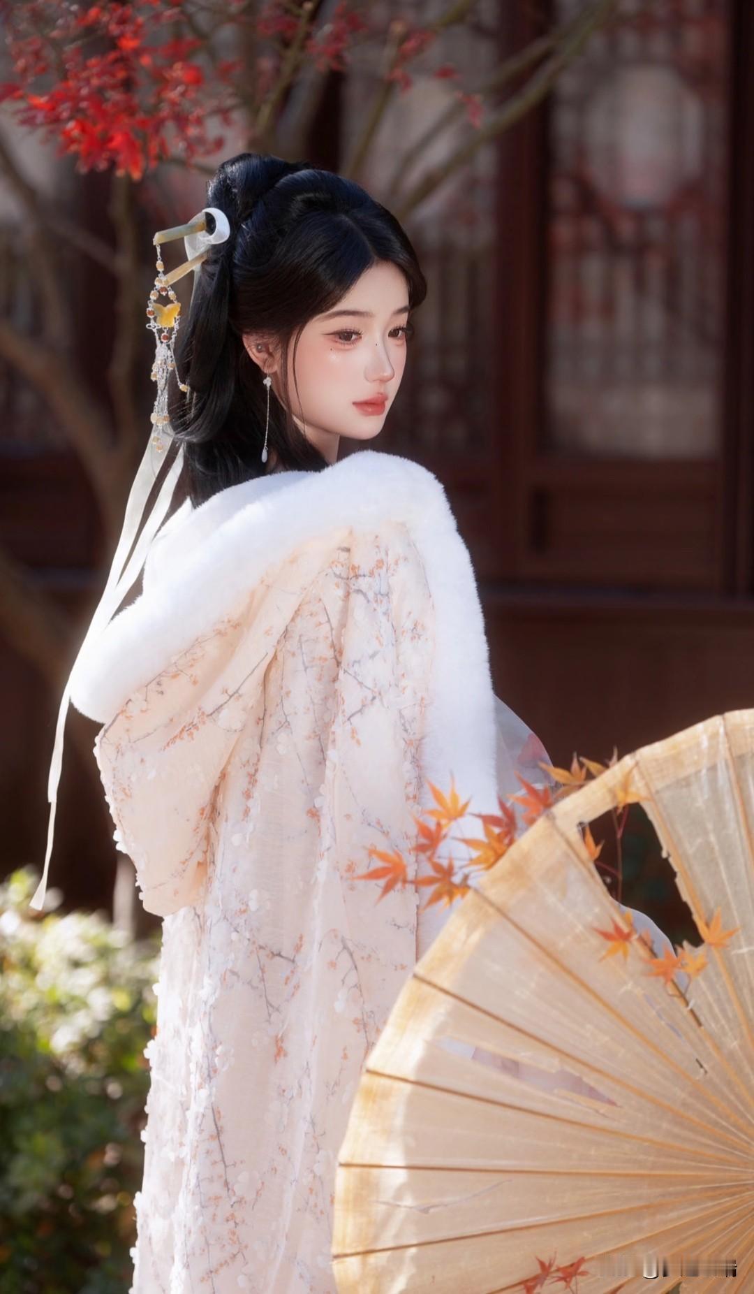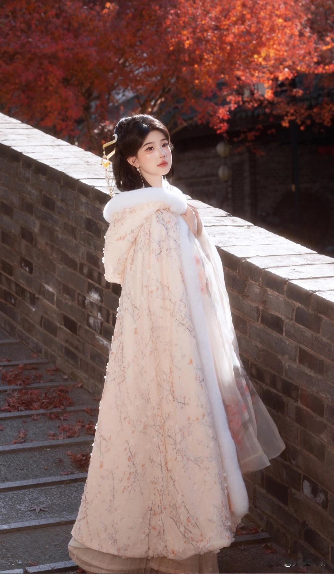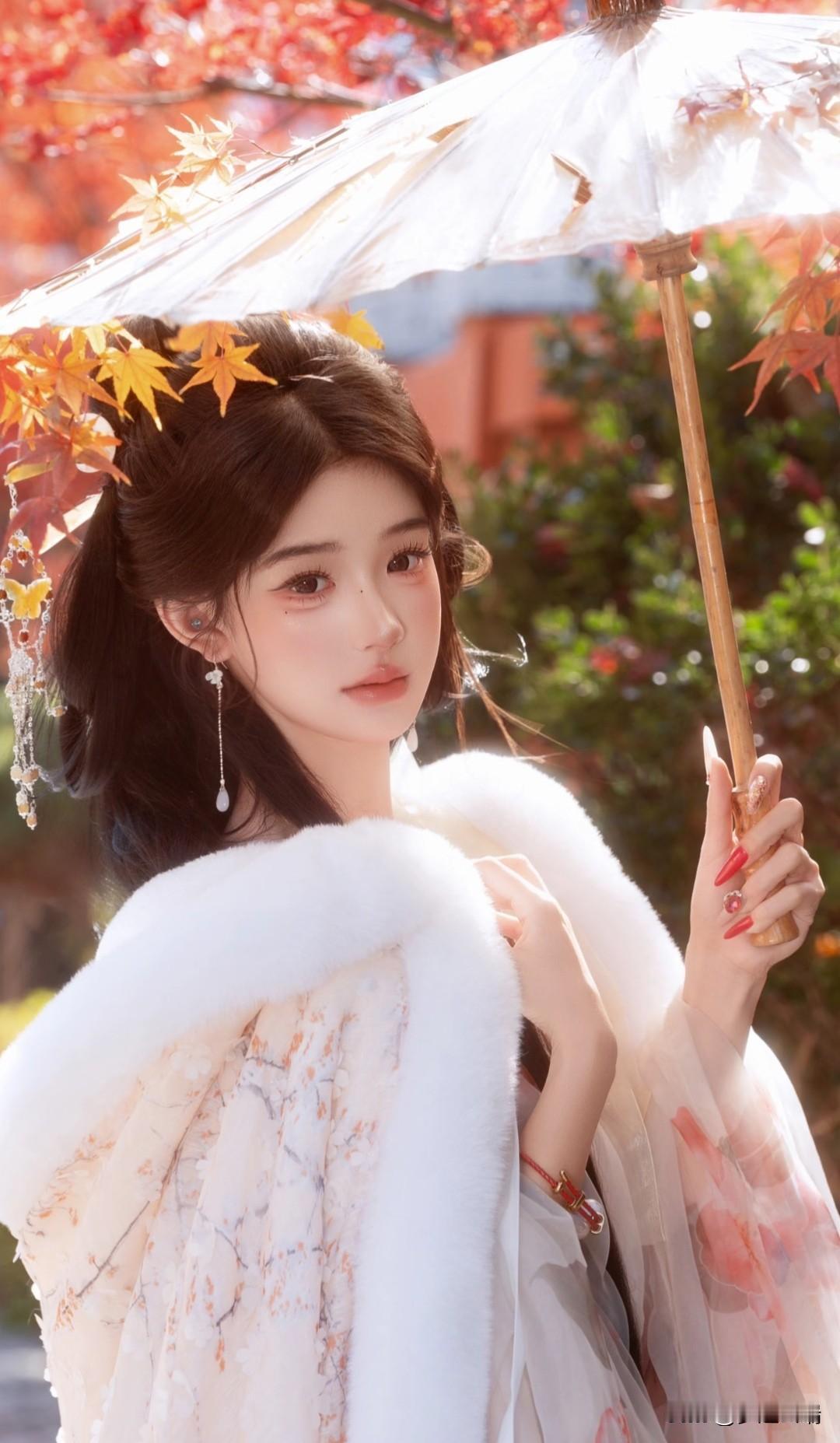 秋日仙子,红叶间轻舞,白衣飘飘,花枝相伴。