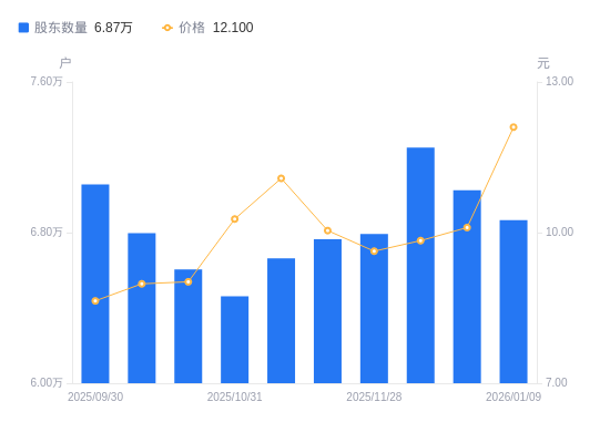 1月14日消息,数据显示,截至2026年1月9日,焦作万方A股股东总户数为6.87万户,较上期(2025年12月19日)减少1586户,降幅2.26%。公司最新A股总股本为11.92亿股,其中流通A股11.91亿股,户均持有流通A股数量为1.74万股,较上期增加391.79股,增幅2.31%;户均持流通A股市值21万元,较上期增加3.87万元,增幅22.57%。