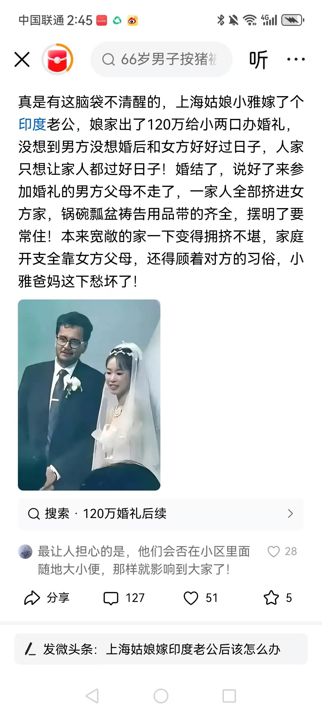 国际友人印度最强,用不了多久,这家就会来几十个印度老乡,这女家多傲娇啊,嫁了个外国人。这家人可好,女婿亲家公亲家婆一起(嫁)过来了! 没毛病啊,印度人结婚都是女方给彩礼,给的不多小心打你哦。 放眼整个世界,多少外国人向往着我们中国的和平与安宁,各个行业的飞速发展。 三哥:天天去黄浦江洗澡,随地大小便,那手指,还有臭味,不怕怕? 这不是好事吗,花了120万,男方一家人都招来了,填了几个能挣钱的,多骄傲啊! 从很多例子来看,印度人不会找中国的穷女孩子结婚。印度是女方出彩礼,女方不出丰厚彩礼,婚后男方整死你! 真是晕了头了,就是娶来的媳妇,也不可能让老丈人一家的人来男方家居住,况且是男方一家人都来女方家居住,真是晕到家了。 嫁鸡随鸡嫁狗随狗,嫁个印度老公就应该跟着一起去印度生活,不要赖在中国才对。 最让人担心的是,他们会否在小区里面随地大小便,那样就影响到大家了!
