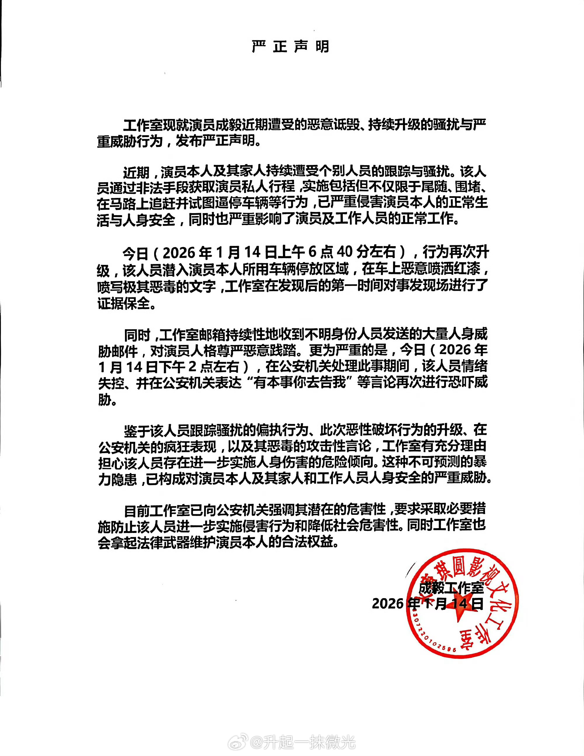 成毅工作室声明年度角色前四成毅占三好演员不应该遭遇这个!请还社会公平清朗!被泼红油漆、威胁人身安全、围堵、尾随、跟踪、马路上逼停车、发辱骂邮件。。。多少年没听说过这种事了,而现在就赤裸裸地发生在我们身边,和谐社会、法治社会,不可思议!到底是贵圈的某些人,某种规则容不下一个正能量只想好好演戏的好演员,还是只是个体所为?这已经不是简单的娱乐圈问题,已上升到严重的社会事件!国家严打扫黑除恶这么多年了,为什么还有这种事发生?请严查一查到底❗️❗️❗️一个公众人物在浙江省金华市横店这个地方,人身受到威胁,无论从文旅、治安、营商环境、都会成为贵地一个反面典型,请当地相关部门给予足够重视