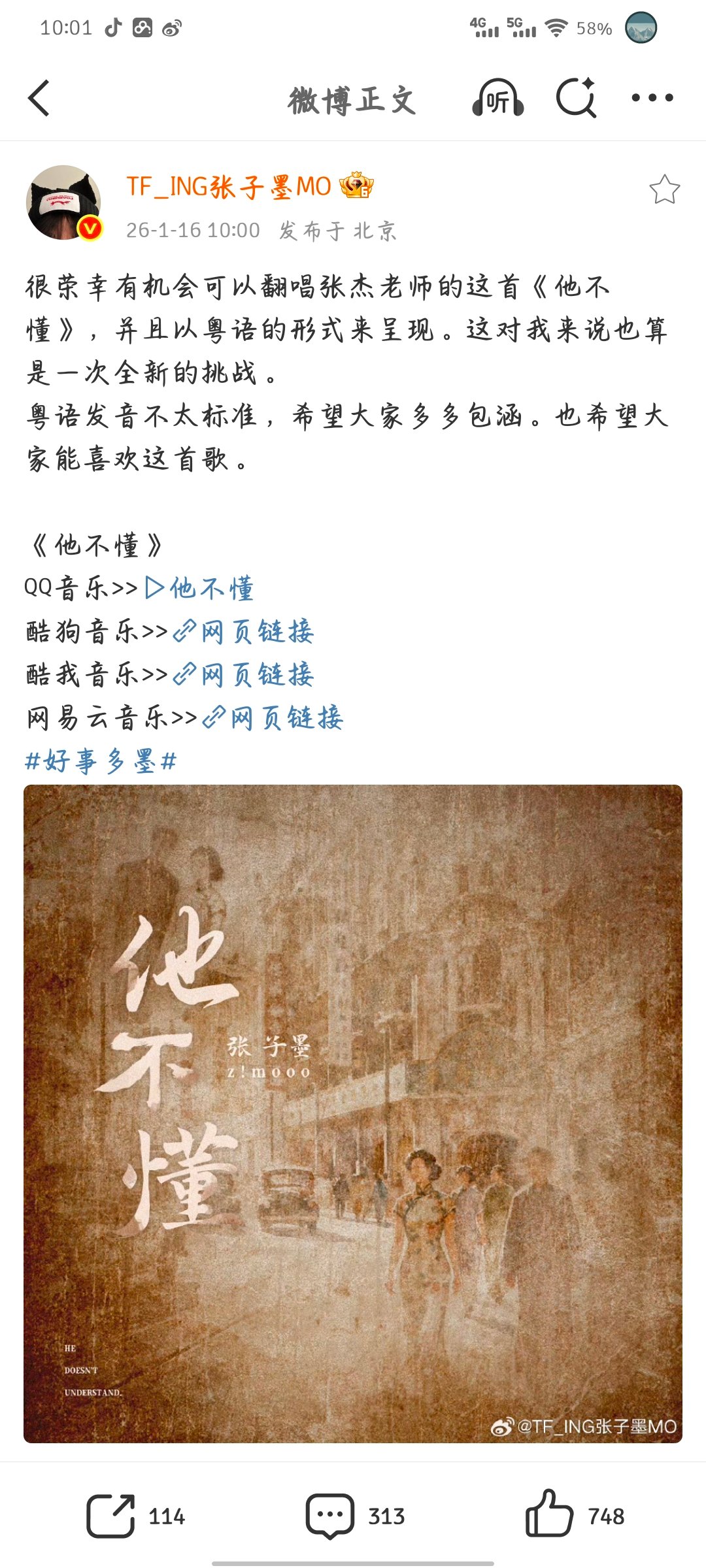 张子墨张子墨翻唱他不懂粤语版张子墨以粤语形式翻唱张杰老师的《他不懂》这对他来说也算是一次全新的挑战。粤语发音不太标准,希望大家多多包涵。也希望大家能喜欢这首歌张子墨翻唱粤语版他不懂