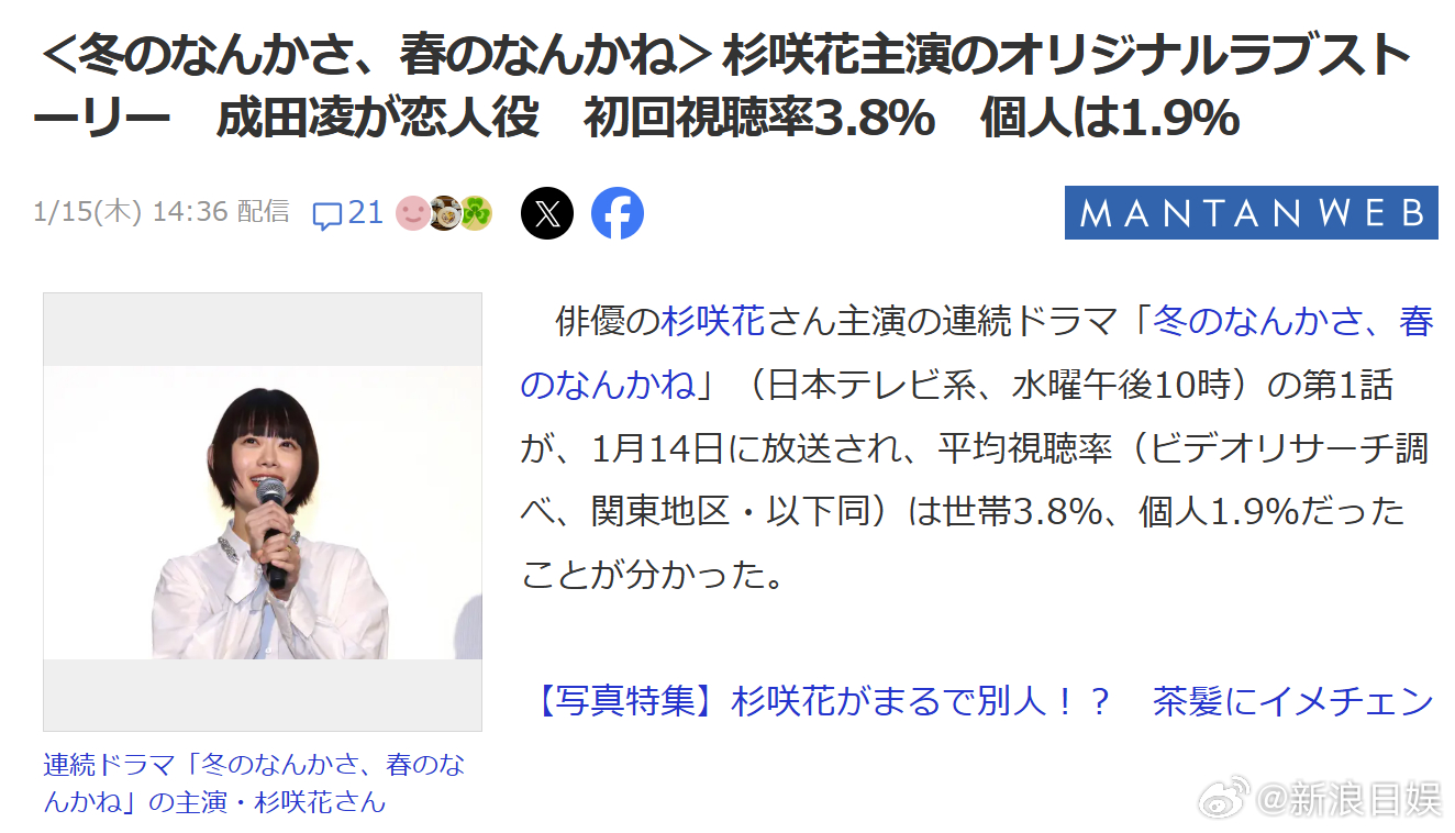 海外影视速递 杉咲花主演、今泉力哉 任导演兼编剧的NTV 1月期水10剧《冬天的什么呀,春天的什么来着》首集于1月14日开播,世代收视率3.8,个人收视率1.9。该剧讲述了在迷茫中依然认真生活的女主角所经历的爱情故事。土田文菜(杉咲花饰)虽有恋人,却因过往种种恋爱经历的影响,不知不觉开始回避好好去喜欢一个人。剧中将细致描绘从学生时代恋人到现任恋人之间,与每一位对象共度的时光与恋爱心情。