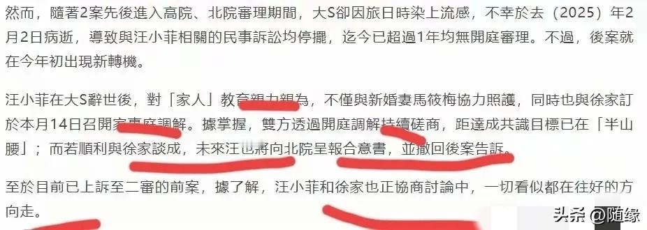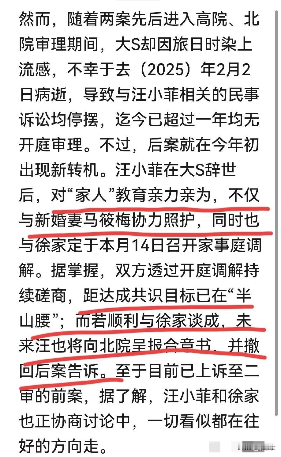 徐汪两家一切都在往好的方向走! 徐家终究还是为了大S的两个孩子,放下恩怨情仇了。 据说两家已经达成初步共识,不再纠结过去的恩怨,他们正在调解协商之中,若能顺利谈成,双方将撤回后案告诉。 没想到,这次湾湾媒体竟然夸赞起汪小菲,对“家人”教育亲力亲为,与妻子马筱梅协力照护。S妈也正是看到了汪小菲和马筱梅对孩子尽心尽责,两个孩子得到了很好的照顾,很放心。所以才想为了孩子,也为了完成大S的遗愿,才选择了和解。其实,这才是最好的选择。 讲真,两家和解才是对已故大S最好的告慰。