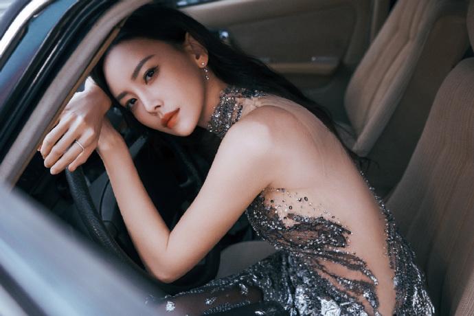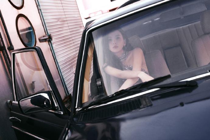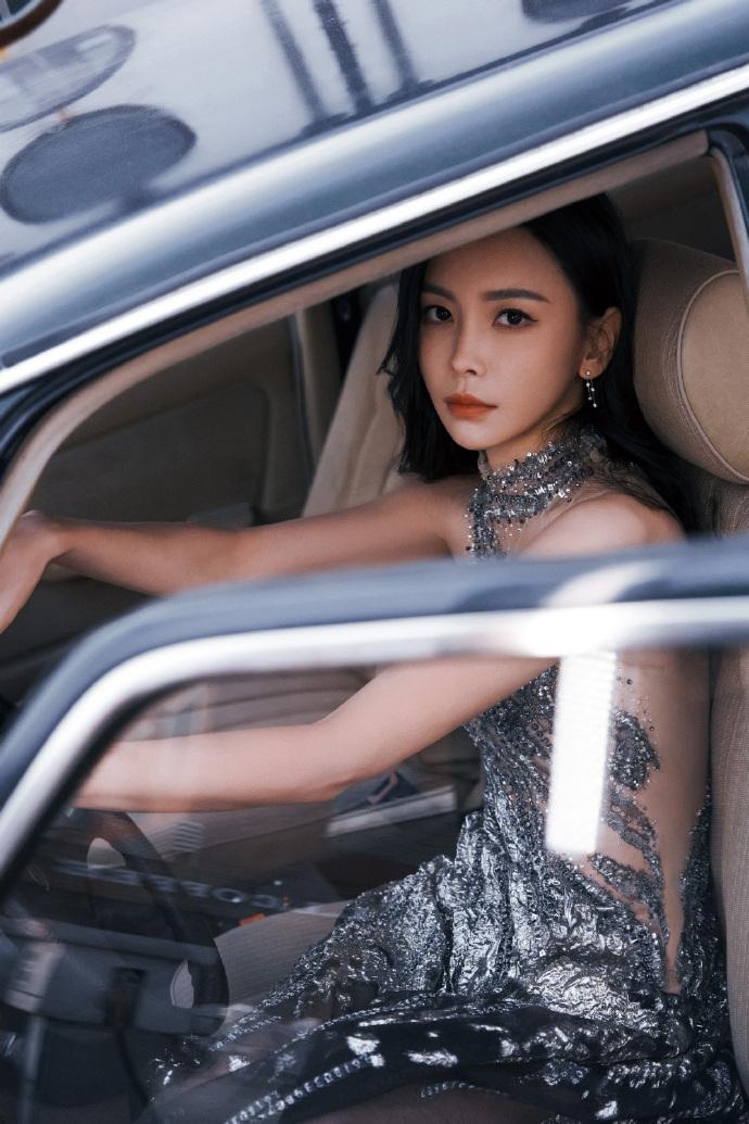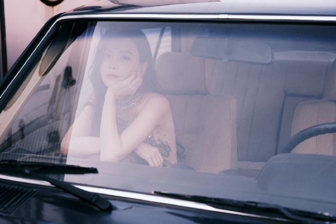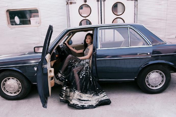 深灰石墙的冷硬与纱裙的柔润形成强烈对比,孟子义用松弛的姿态与精致的珠宝点缀,打造