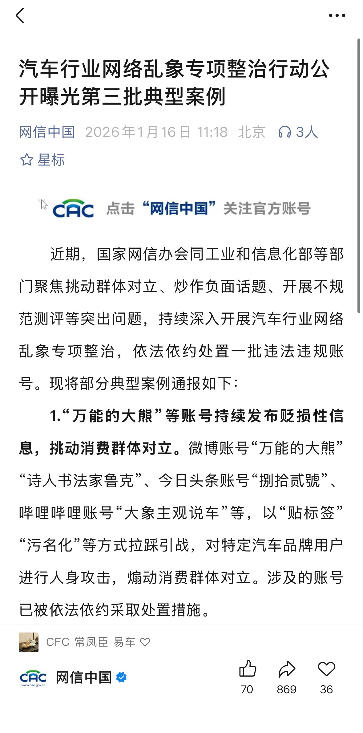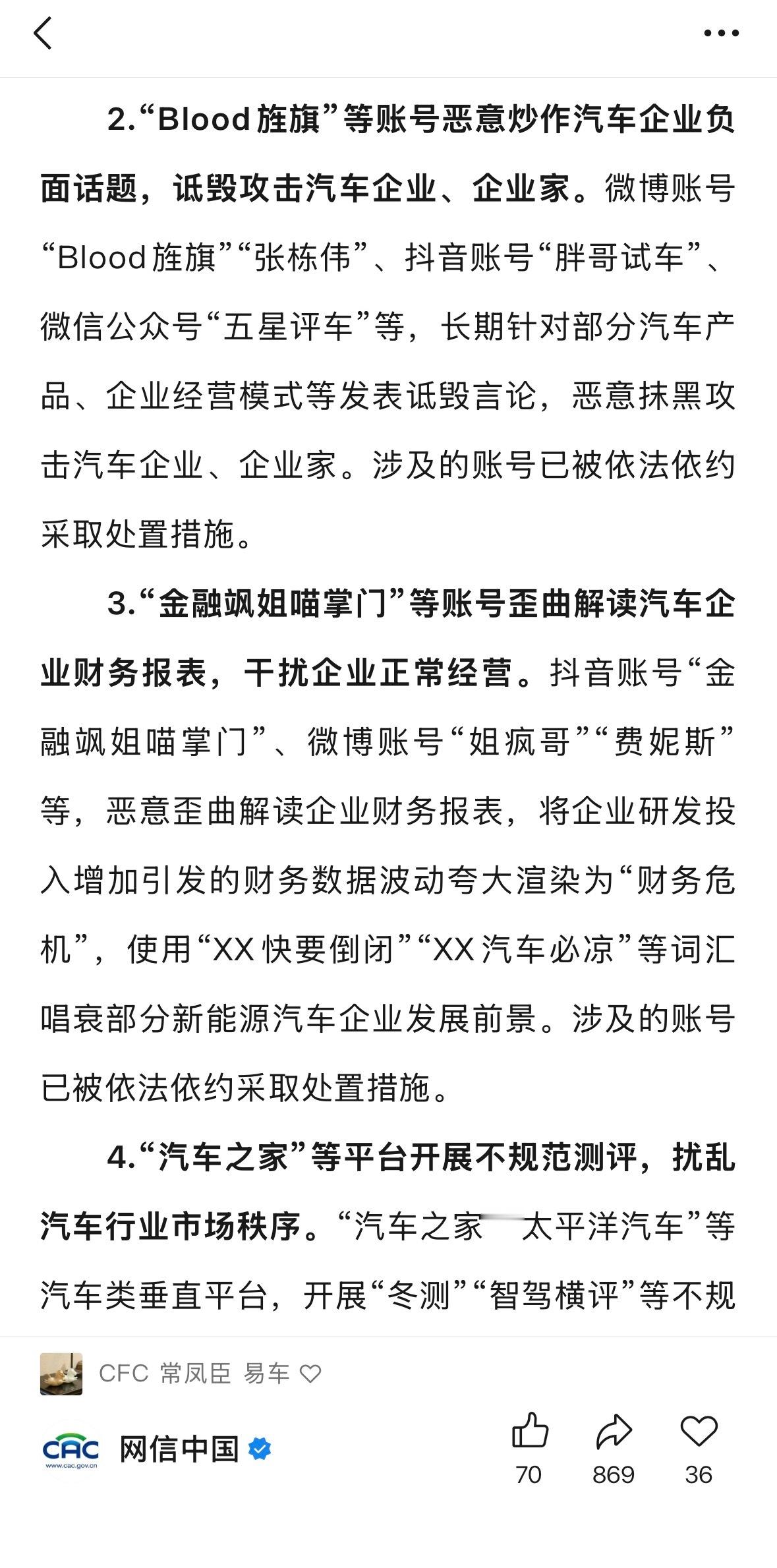 1.“万能的大熊”等账号持续发布贬损性信息,挑动消费群体对立。微博账号“万能的大熊”“诗人书法家鲁克”、今日头条账号“捌拾贰號”、哔哩哔哩账号“大象主观说车”等,以“贴标签”“污名化”等方式拉踩引战,对特定汽车品牌用户进行人身攻击,煽动消费群体对立。涉及的账号已被依法依约采取处置措施。2.“Blood旌旗”等账号恶意炒作汽车企业负面话题,诋毁攻击汽车企业、企业家。微博账号“Blood旌旗”“张栋伟”、抖音账号“胖哥试车”、微信公众号“五星评车”等,长期针对部分汽车产品、企业经营模式等发表诋毁言论,恶意抹黑攻击汽车企业、企业家。涉及的账号已被依法依约采取处置措施。3.“金融飒姐喵掌门”等账号歪曲解读汽车企业财务报表,干扰企业正常经营。抖音账号“金融飒姐喵掌门”、微博账号“姐疯哥”“费妮斯”等,恶意歪曲解读企业财务报表,将企业研发投入增加引发的财务数据波动夸大渲染为“财务危机”,使用“XX快要倒闭”“XX汽车必凉”等词汇唱衰部分新能源汽车企业发展前景。涉及的账号已被依法依约采取处置措施。4.“汽车之家”等平台开展不规范测评,扰乱汽车行业市场秩序。“汽车之家”“太平洋汽车”等汽车类垂直平台,开展“冬测”“智驾横评”等不规范测评项目,并通过相关账号发布以偏概全的汽车测评类信息,误导社会公众对汽车产品质量、功能性能等方面的认知。涉及的账号已被依法依约采取处置措施。