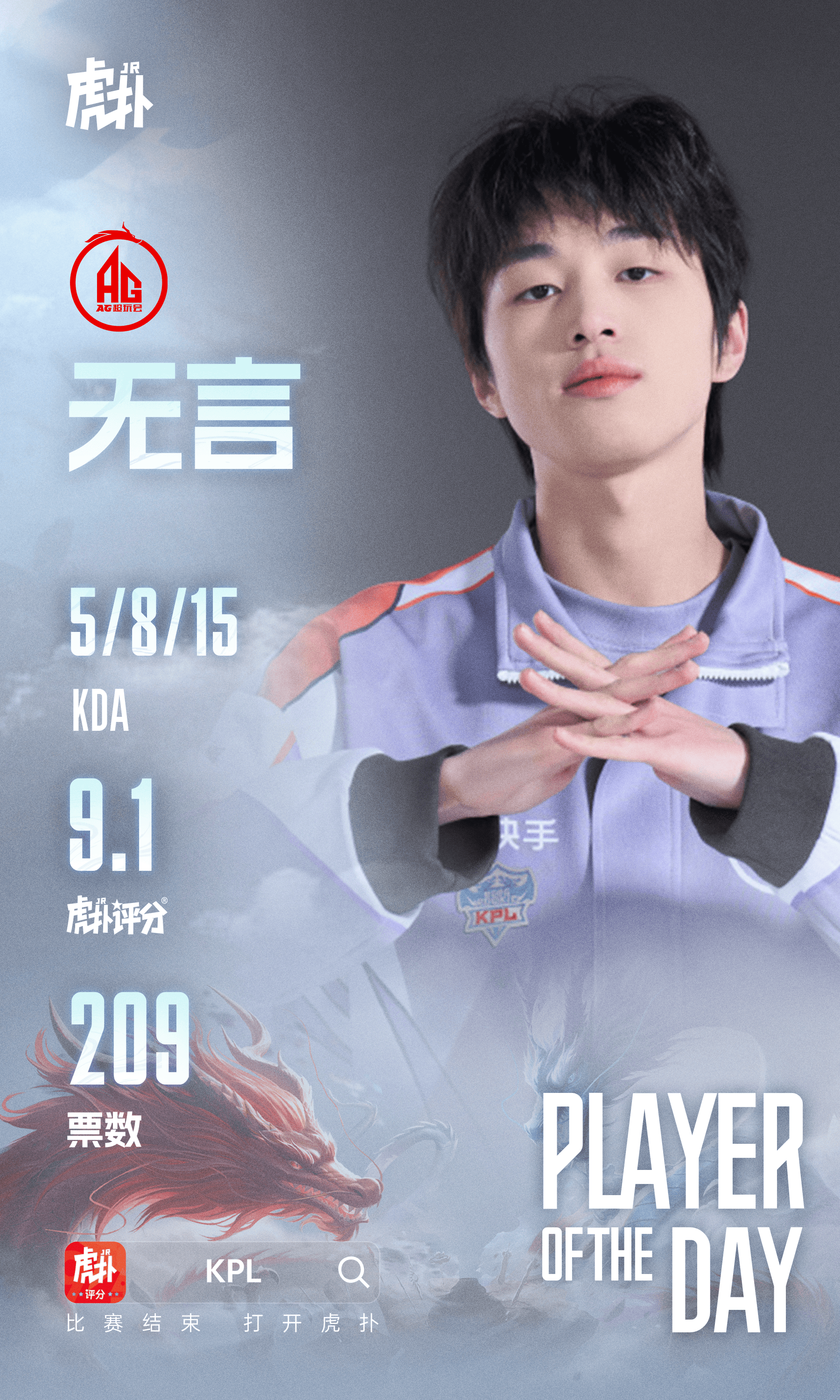 最终无言选手总票数209斩获昨日最佳选手!