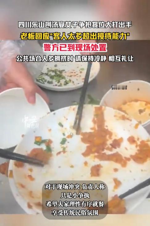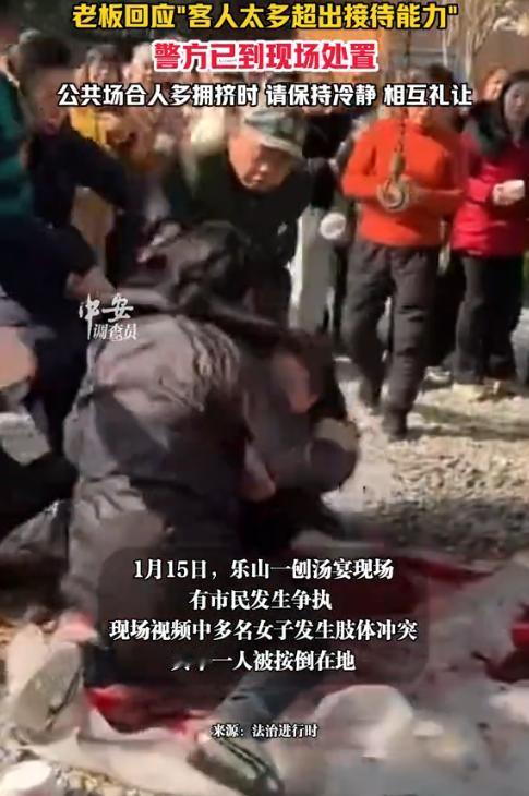 “离了个大谱!”近日,四川乐山,一农家乐自行举办了一场刨汤宴,邀请各地好友前去参加,没想到等待开席时,现场多名女子竟开始争抢位置发生口角,而后甚至大打出手,其中一人还被按倒在地,现场一片混乱。网友:为了吃顿饭至于吗? 自从重庆呆呆的杀猪宴火了之后,各地网友也开始举办杀猪宴。而年末的刨汤宴本是热热闹闹的民俗饭局,街坊邻里围坐在一起吃杀猪菜、话家常,图的就是个喜庆团圆。可四川乐山这场宴席却因座位不足,上演了一场不堪的闹剧。 据媒体1月16日报道,一男子看到最近的刨汤宴火了之后,想着自己家是开农家乐的,便也想举办一场,热闹一下。于是他开始一边宣传一遍备好场地和食材,没想到宴席当天前来的客人远远超过预期。很多人到了之后,甚至找不到位置坐。 就在这时,场地中央的一桌旁,几名女子为了抢占位置发生口角,随后很快开始动起手来,几人扭打在一起,其中一位女子直接将另一位女子按倒在地,旁边有帮忙的,有劝架的,也有看热闹的,场面顿时混做一团难以控制。 眼看事态升级,男子赶紧报警。随后警方迅速赶到现场处置,才将冲突双方拉开,避免了事态进一步升级。事后,男子表示,当天到店的客人数量远超预期,超出了门店的接待能力,导致现场秩序混乱,才引发了这场冲突。 一顿热热闹闹的刨汤宴,本是为了图个喜庆团圆,却因争抢座位大打出手,既坏了心情,也失了风度,实在得不偿失。网友看后表示,为了吃顿饭大打出手,太丢人了。 信息来源:《1月16日四川乐山(发布),四川乐山刨汤宴女子争抢餐位大打出手,老板回应"客人太多超出接待能力",警方已到现场处置,公共场合人多拥挤时请保持冷静 相互礼让。》中安在线