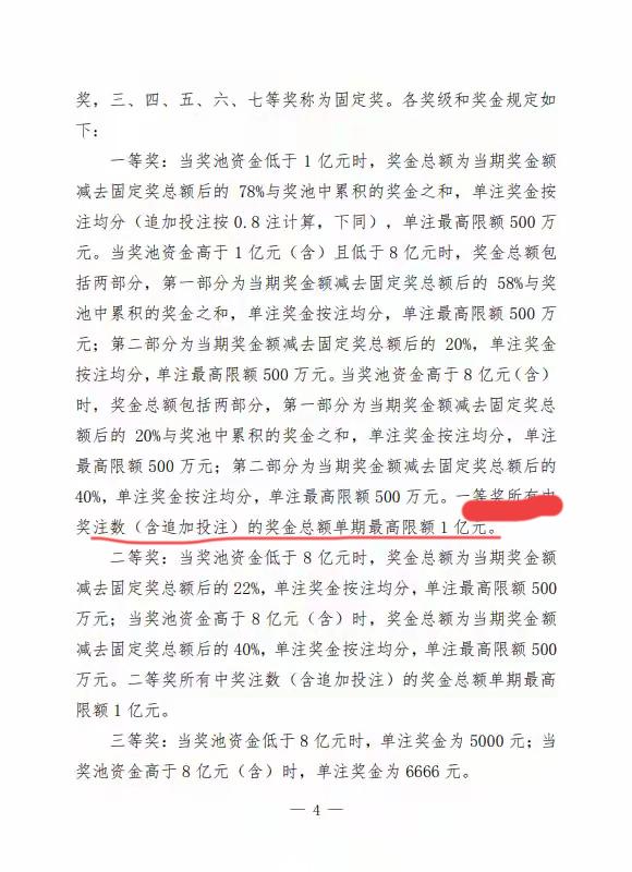 体彩超级大乐透重大改版,以后再也没有超过1亿元的大奖了! 有一条直接给限制死了,以后再也没有超过1亿元的大奖了,中了20注一等奖和中200注一等奖,总分的金额都是一个亿,也就是说一等奖金有可能被稀释。 假设当期一等奖的中奖人数太多,很有可能一等奖的中奖金额会被拉得非常低。这也是为了防止很多人玩倍投的方法,比如说50注倍投,很有可能就会中亿元以上大奖。 各位是怎么看的?欢迎评论区留言。