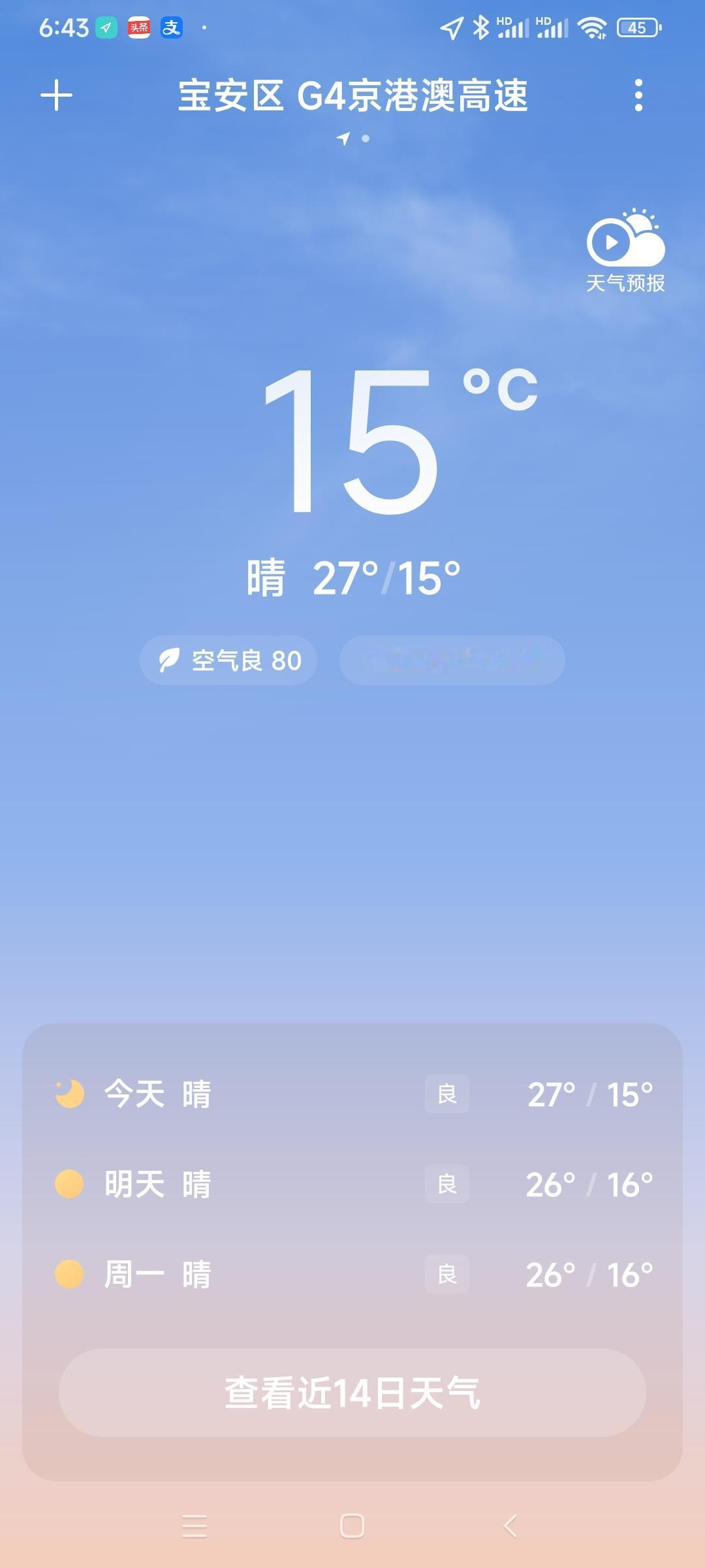 我的今日状态:😁轻松愉快 我这里的天气:☀️晴天深圳今日晴,气温15度到27度