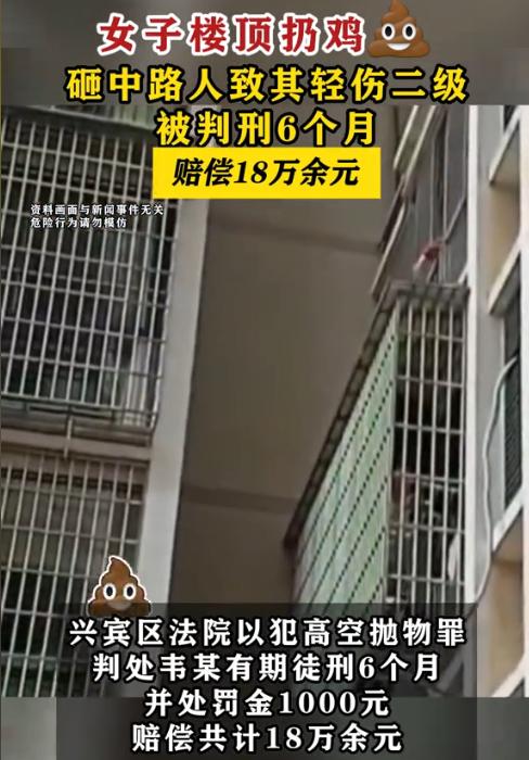 “这下后悔了吧!”近日,广西来宾,一女子在楼顶养鸡,这天给鸡清完粪便后,为了图方便,就将装满鸡屎的袋子直接从楼顶扔了下去,不巧刚好砸中了路人的脖子和颈椎。女子被法院判刑6个月,赔偿对方18万。网友:判得好! 高空抛物的事件总是时有发生,很多人总抱着“扔点小东西不会出事”的侥幸,或是懒得多走几步路,便随手将垃圾、杂物甚至鸡屎从高空抛下。但他们没意识到,这些看似不起眼的“随手一扔”,在重力加持下都会变成致命凶器,给受害者带来无妄之灾。 据媒体1月16日报道,韦女士在自家3楼楼顶盖了个鸡舍养了几只鸡,每天她都要给鸡清理粪便,为了图方便,她索性将装鸡屎的袋子直接从三楼楼顶扔了下去。一开始的时候她还会向下望望,看看有没有人,后来扔的久了,就习惯了,看都不看每次清理完就顺手一丢。 不料这天下面刚好有人走过,韦女士扔完鸡屎,就听下面传来“啊”的一声,过去一看,发现鸡屎砸在了路人的脖子和颈椎上,对方顿时又疼又恼,不仅脖子动不了了,还一身鸡屎味。 对方对于韦女士高空抛物的行为很是气愤,于是便将她告上了法院。法院审理认为,韦女士的行为造成对方轻伤二级,且已构成高空抛物罪,最终判处其有期徒刑6个月,并赔偿伤者各项损失共计18万元。 网友看后表示,高空抛物无小事,别拿别人的安全当儿戏,这下好了一袋鸡屎18万,长记性了吧! 信息来源:《[
