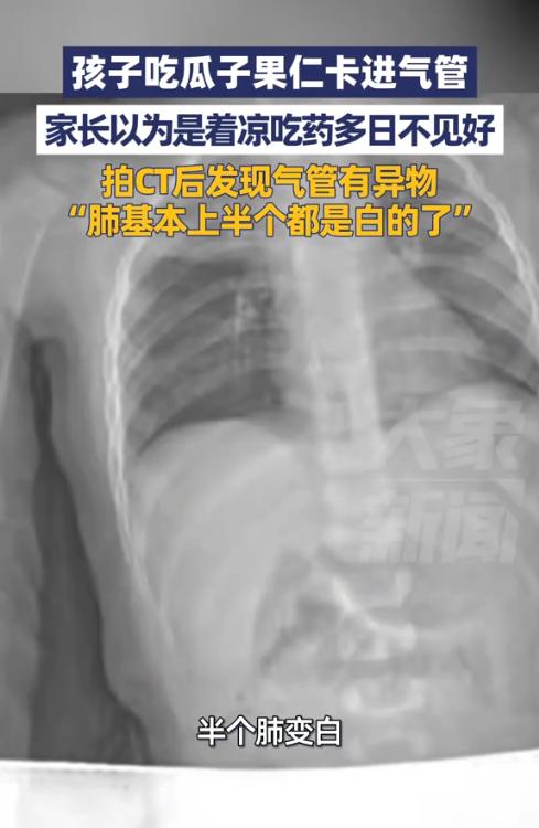 “悲剧还是发生了!”近日,一3岁男童在吃瓜子时突然摔倒,第二天,就出现咳嗽低烧的症状,家长喂了点感冒药后仍旧不见好,并且还愈发严重,孩子开始咳嗽剧烈、呼吸急促,慌忙送医后竟发现半个肺都变白了!网友:太吓人,家长千万警惕! 孩子咳嗽发烧是家长常遇的情况,不少人会下意识归为普通感冒,自行喂药缓解,却忽略了有些症状背后藏着的巨大风险。 据媒体1月16报道,这名3岁男童在家吃瓜子时,突然跑起来玩,不料一下摔倒了,出现呛咳反应,但仅过了两分钟,孩子就恢复了正常状态,家长觉得只是小意外,也就没有在意。 可第二天,孩子就出现了轻微咳嗽、低烧的症状,家人以为是普通感冒,就给孩子喂了儿童感冒药。不料连续用药几天后,孩子的病情不仅没有好转,反而急转直下:咳嗽变得剧烈频繁,呼吸时还带着喘息声,稍微活动就会憋得满脸通红,精神状态也越来越差。 看着孩子痛苦的模样,家长再也不敢拖延,赶紧抱着孩子赶往当地医院急诊。检查结果出来后全家人如遭雷击:孩子的气管内卡着一颗瓜子仁,异物长期堵塞引发了严重的肺部感染,影像片上清晰显示半个肺都已经发白。 家长懊悔不已,不断自责当初没有重视孩子呛咳的瞬间。好在手术及时,孩子术后经过一周的抗感染治疗,肺部炎症逐渐消退,呼吸也恢复了正常。 因此一定要注意,小孩子在跑闹玩耍的时候,尽量不要吃坚果,如果出现呛咳、持续咳嗽、呼吸异常等情况,切勿盲目用药,应立即就医排查异物卡喉可能。 信息来源:《1月16日河南报道,孩子吃瓜子果仁卡进气管,家长以为是着凉吃药多日不见好,拍 CT后发现气管有异物,“肺基本上半个都是白的了”大象主播说