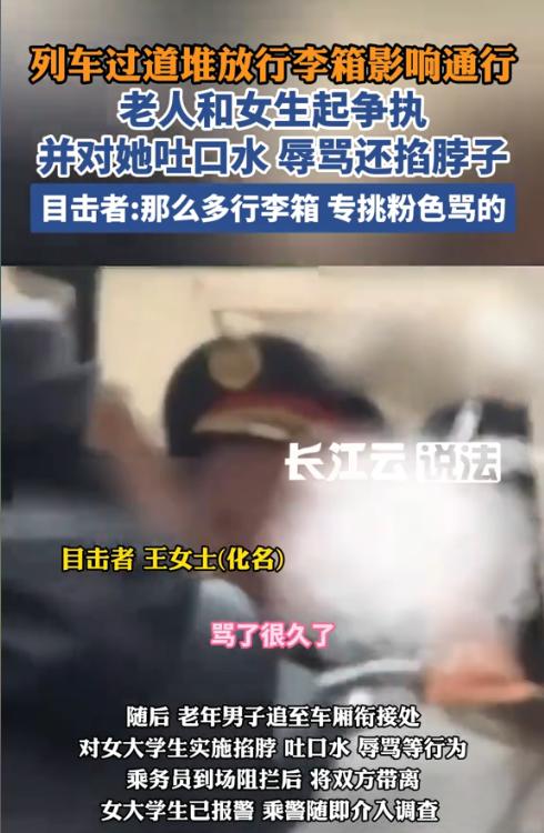 “太欺负人了!”近日,一男子在行驶车厢内违规抽烟时,因女孩的行李箱挡住通道发生争执。男子情绪突然失控,不仅朝女孩脸上吐口水,还伸手掐住她的脖子试图施暴,周围乘客连忙上前制止。视频曝光后引发全网愤怒,网友纷纷表示:“太嚣张了,必须严惩!” 春运返乡高峰时,列车车厢总是挤满了人,大家都拎着大包小包的行李。通常情况下行李架放不下时,大家都会把箱子暂放在过道或洗手池旁的空隙,但也不会完全堵住过道,大家都会侧身通行、互相体谅。但在这趟列车上,却发生了不愉快的一幕。 据媒体1月16日报道,事发时车厢里满是放假返乡的大学生,很多人行李放不下就堆到了洗手池的过道处,其中就有一个粉色行李箱,是一名女大学生的。这时,一位白发男子就叼着烟走过来,明明侧身就能轻松通过,却偏偏停下脚步,不走了,指着粉色箱子就开骂,嫌弃挡路了。 男子骂了很久,女大学生忍不住回了一句“恶心”。没想到这句话瞬间点燃了男子的怒火,他猛地冲上前,一边嘴里骂骂咧咧,一边多次朝女孩脸上吐口水,甚至伸手掐住她的脖子,把人狠狠按在车厢壁上施暴。周围乘客见状连忙上前拉架,现场一片混乱,直到乘务员和乘警赶到,才将情绪失控的男子控制住。 这段冲突视频在网上曝光后,立刻引发网友愤怒。知情人士还表示,其实侧身就能过去,很多箱子都摆在那,但多数都是黑箱子,就那一个粉的,他就挑她说。网友纷纷怒斥,典型的欺软怕硬,列车上抽烟本来就违法,还打人吐口水,必须拘留严惩! 信息来源:《男子在列车上掐女生脖子并多次朝她吐口水。铁路客运段:正核查处理。》长江云说法