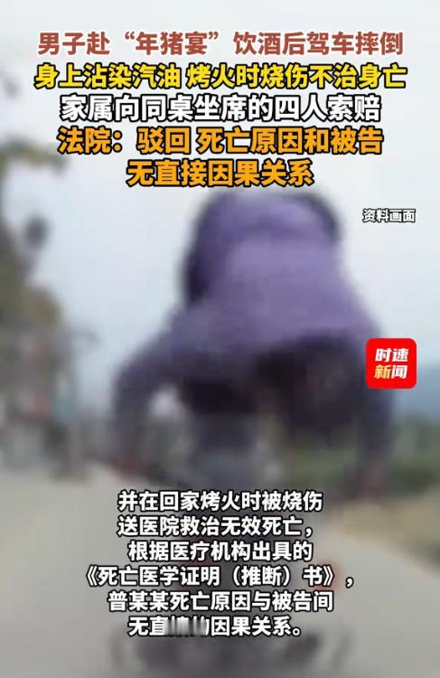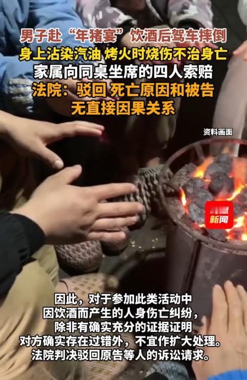 “悲剧还是发生了!”近日,云南,一男子参加“年猪宴”饮酒后,执意要骑无牌的摩托车回家,途中不慎摔倒导致摩托车油箱破裂,汽油顿时泼满全身。他浑然不觉危险,回家后竟直接凑近炭火盆烤火,瞬间引发爆燃,最终因烧伤过重身亡。家属起诉同席者要求赔偿。法院:驳回诉讼请求! 年猪宴是乡村年底最热闹的团圆时刻,邻里围坐吃肉喝酒,充满烟火气,可很多人容易酒后心存侥幸,觉得家近、路熟就没事,却忽略了那些藏在细节里的致命风险。 据媒体1月16日报道,男子受邀参加村里的年猪宴,席间他喝了不少白酒。酒后,亲友见他走路不稳,纷纷劝他留宿或叫家人来接,但他仗着自己“酒量好、骑车稳”,执意要骑着自己的无牌摩托车回家。 不料行驶途中,酒精上头让他反应迟缓,连人带车摔倒在路边,摩托车油箱顿时破裂,汽油顺着裤腿和外套流满全身。男子起身后只觉得衣服湿了,并未察觉危险,一路晃悠着回到家。 为了驱散身上的寒气,他立刻凑近屋内的炭火盆烤火,不料下一秒,身上的汽油遇火爆燃,瞬间将他裹在火焰里。家人见后虽第一时间扑火送医,但男子最终因烧伤面积过大、伤势过重,抢救无效身亡。 事后,男子家属将同席饮酒的亲友告上法庭,要求承担赔偿责任。但法院审理后认为,没有证据证明同席者存在强行劝酒或灌酒行为,且已尽到口头劝阻酒驾的义务,男子死亡的直接原因是酒驾摔倒后汽油泼身,又主动靠近火源,属于自身重大过失,因此判决同席者无需承担责任。 这起悲剧也给所有人敲响警钟,年末聚餐增多,饮酒后切勿心存侥幸驾驶,一旦发生意外,不仅危及自身,也会给家庭带来无法挽回的伤痛。 信息来源:《男子赴“年猪宴”饮酒后驾车摔倒,身上沾染汽油,烤火时烧伤不治身亡,家属向同桌坐席的四人索赔,法院:驳回,死亡原因和被告无直接因果关系杀猪宴汽油法律