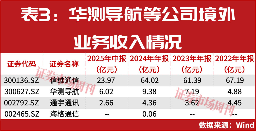 其中,华测导航通过产品的性价比发力海外市场,海外收入规模不断扩大。2020-2024年,公司海外市场收入从1.98亿元增长至9.38亿元,年均复合增速达到47.53%。在2022-2024年,信维通信、通宇通讯的海外市场收入也保持在较高水平上(见表3)。