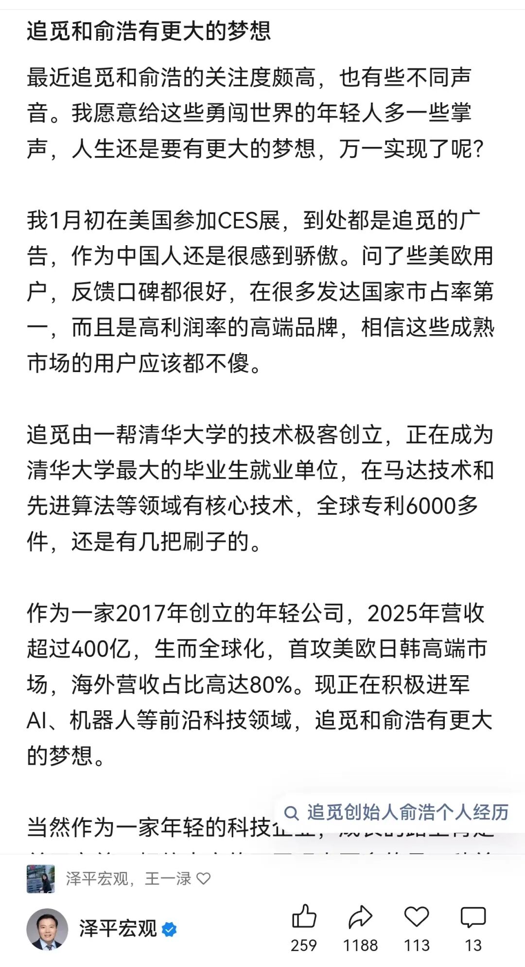 值得一提的是,1月17日,网红经济学家任泽平也对俞浩进行了评价,任泽平对俞浩及追觅科技持高度肯定和鼓励态度。他在其微信公众号文章中明确表示,愿意给追觅团队“多一些掌声”,并赞赏其拥有“更大的梦想”。他基于实地观察指出,追觅在国际市场(如CES展)表现突出,在发达国家市占率领先,且成功树立了高端品牌形象,认为成熟市场用户的选择是对其产品力的有力印证。他特别肯定了追觅由清华技术极客创立的背景、其在马达技术和算法等核心领域的实力(全球专利6000+)以及“生而全球化”的战略(2025年营收超400亿,海外占比高达80%)。任泽平认为,尽管作为年轻企业存在不完美之处,但外界的不同声音更多是“关心和期待”,他最终表达了对追觅团队“飞向更高更远”的祝愿,称“中国需要自己的马斯克和黄仁勋”,认为这个时代需要这样的勇气和锐气。