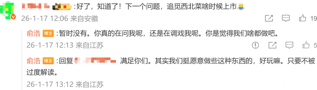 还有网友调侃,追觅西北菜啥时候上市?俞浩回复表示,暂时没有。你真的在问我呢,还是在调戏我呢。你是觉得我们啥都做吧。他还表示,其实我们挺愿意做些这种东西的,好玩嘛。只要不被过度解读。