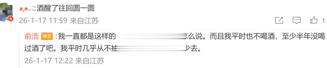 评论区对俞浩平总总体积极正面。也有网友表示,”酒醒了往回圆一圆“,俞浩则回应称,我一直都是这样的,以前怎么说以后还怎么说。而且我平时也不喝酒,至少半年没喝过酒了吧。我平时几乎从不抽烟不喝酒,应酬都很少去。