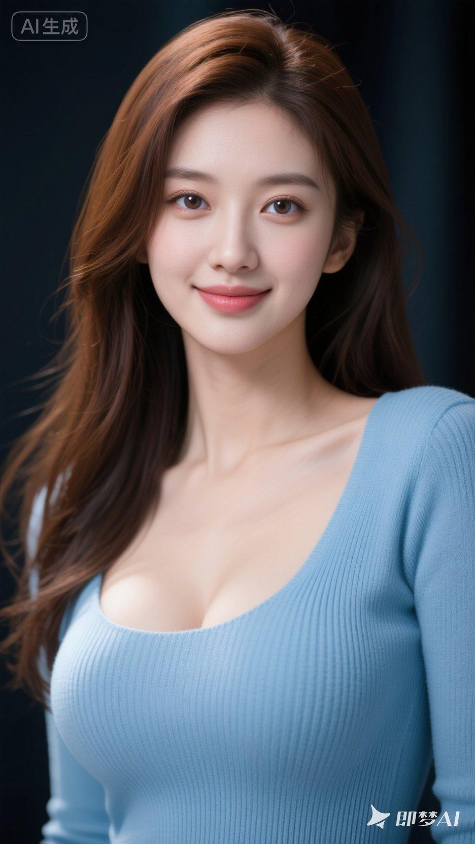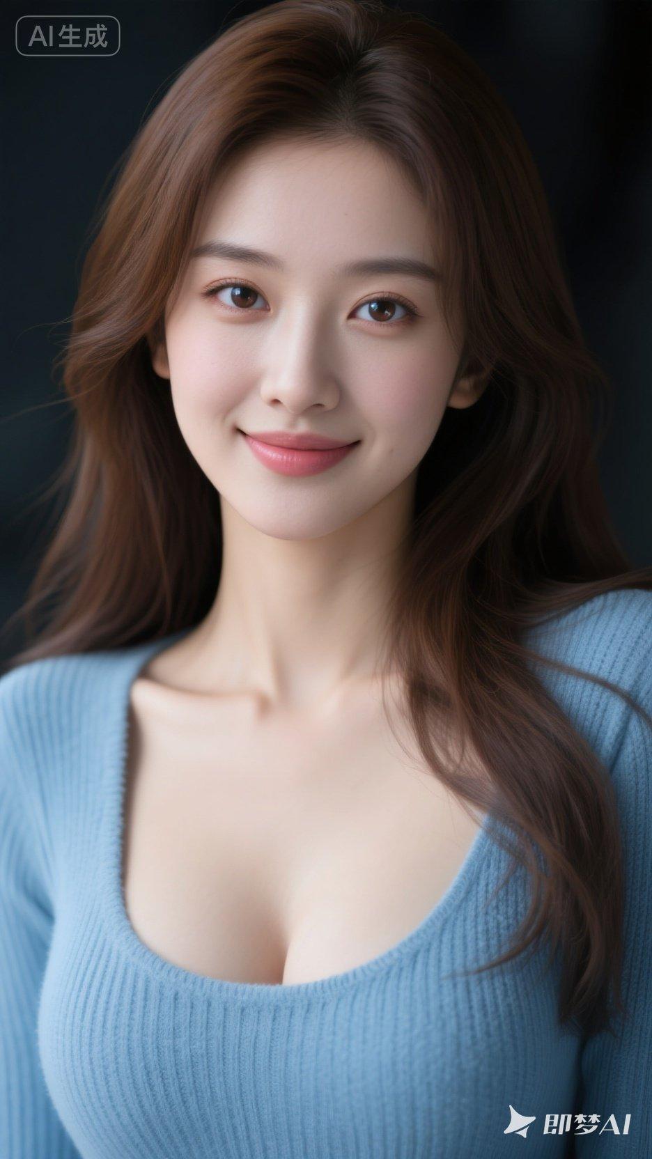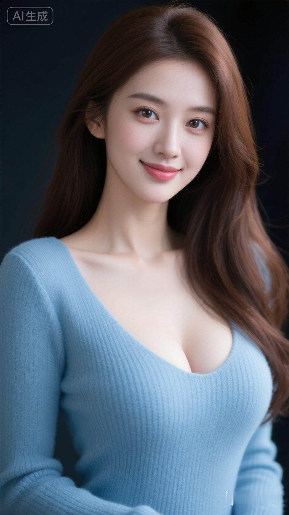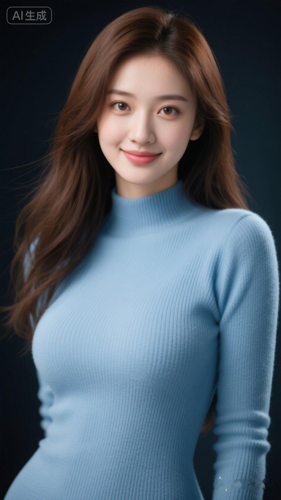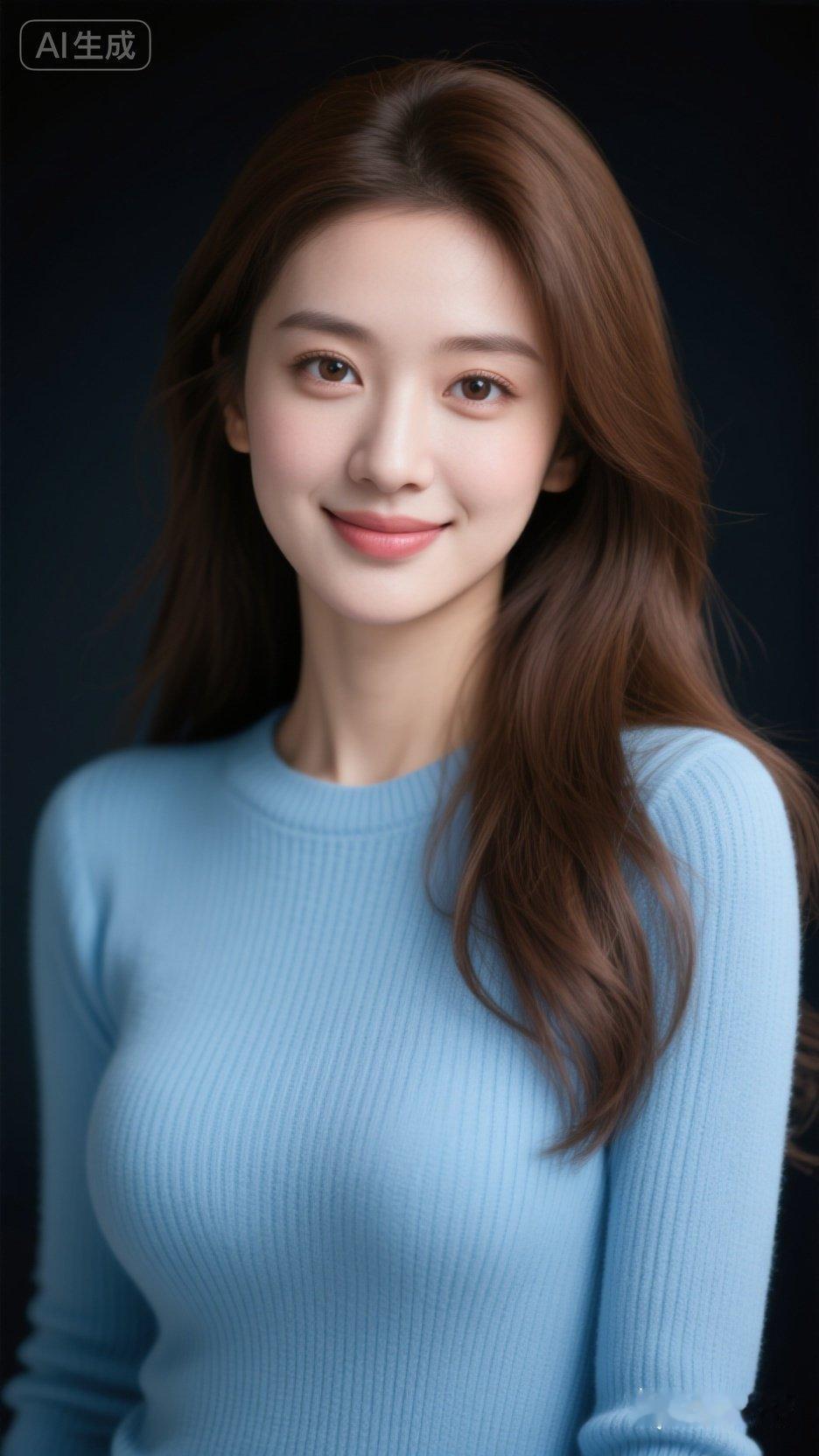 温柔甜美的微笑,蓝色毛衣的清新穿搭,AI生成的完美形象!😊✨