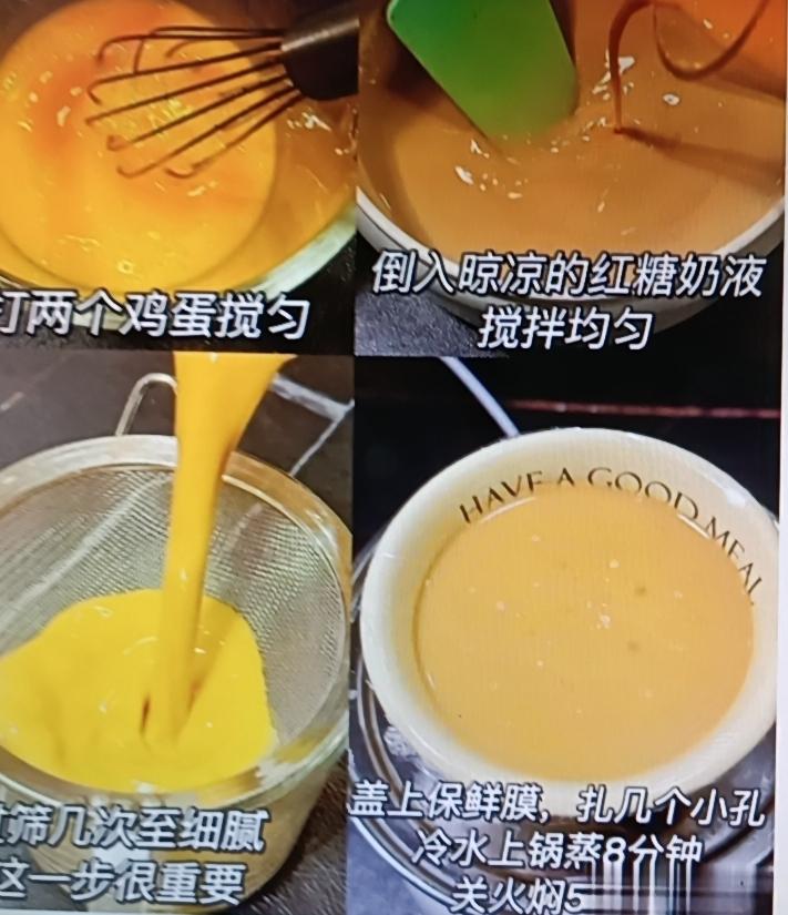 家人们,一定要试试用两个鸡蛋和一杯牛奶做的红糖蛋炖蛋,比双皮奶还嫩! 我按步骤做了一次,直接香迷糊了。准备两个鸡蛋、一盒200ml左右的牛奶、两三勺红糖和一丢丢水。先在小锅里,红糖加水小火熬到冒泡黏稠,满屋子焦糖香。接着倒牛奶搅匀,晾凉。碗里打鸡蛋搅匀,再把凉了的红糖牛奶慢慢倒入并搅拌。重点是过筛,能让口感超细腻。然后盖上盘子或扎孔保鲜膜,水开上锅蒸8分钟,焖5分钟。 成品像布丁一样,勺子一碰就抖,入口即化,红糖味浓却不齁,从喉咙暖到胃,太舒坦了!