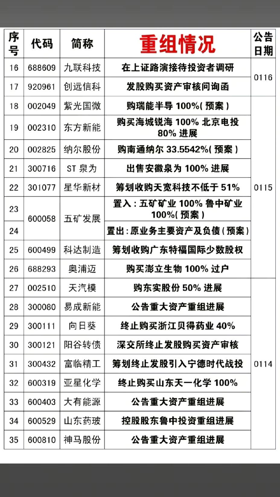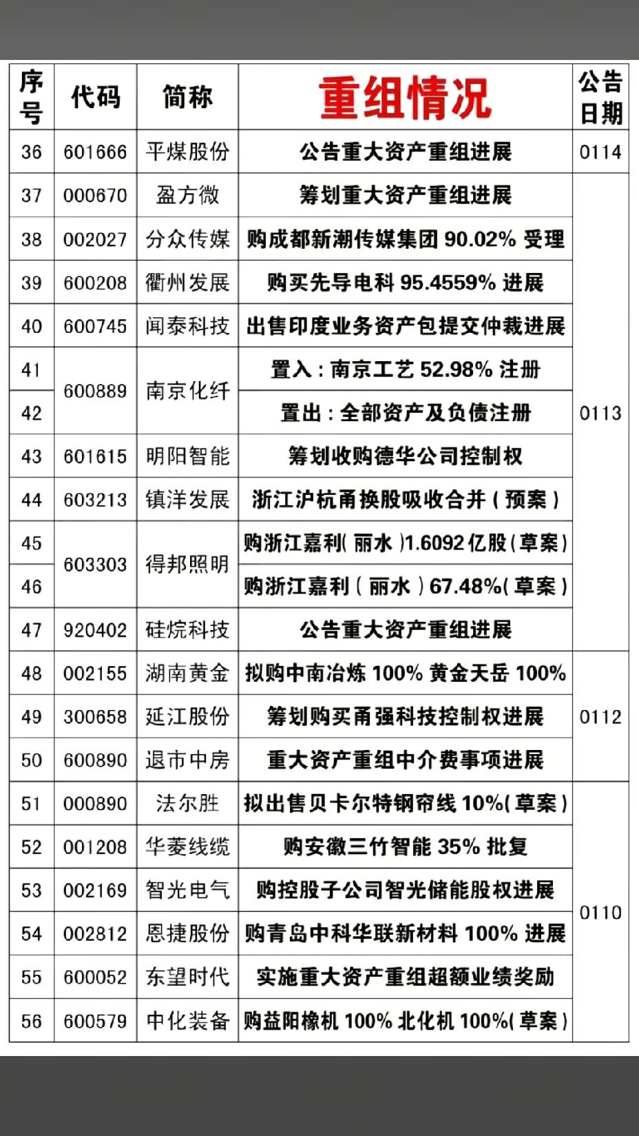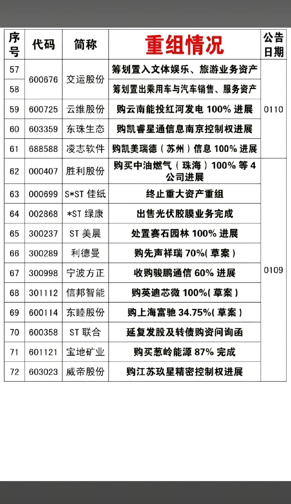 1月18日,下周A股这些股票有望大涨!!! 72家公司披露资产重组情况,重点关注:中成股份购中技江苏清洁能源100%,后市值得高看一眼;时空科技收购深圳嘉合劲威电子100%进展,后市值得重点关注;通业科技拟现金购买思凌科91.69%进展,后市值得期待!!!