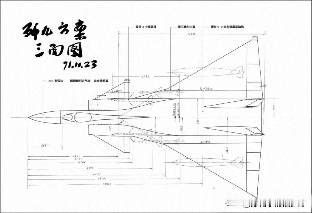 歼九挺可惜的,该型飞机采用了非全动鸭式布局,主翼采用略带双三角形的三角翼型设计。当时,成都所科研团队在全面讨论技术布局后,提出了“无尾,机翼前加小翼”的方案,可大幅改善飞机升力特性,这就是之后国际上流行的“鸭式布局”。 当时,歼九还计划搭载在研的205型雷达和两台910型发动机,挂载中距拦截导弹,在技术上还是较为先进的。 而且,当时美苏等强国空军已经完成“机载武器导弹化”,但国内的歼8等战机仍然使用机炮作为主武器,空对空导弹只作为“超载武器”。但成都所科研团队在研制歼九的时候,已经紧跟世界先进潮流为其配套研制了“导弹拦射”武器系统作为主武器系统。这是我们后来探索‘超视距空战’的重要一步。 当然,由于“种种原因”,歼九还是下马了(有说法是“被迫终止”),不过其“鸭式布局”还是应用到歼10和歼20之上。
