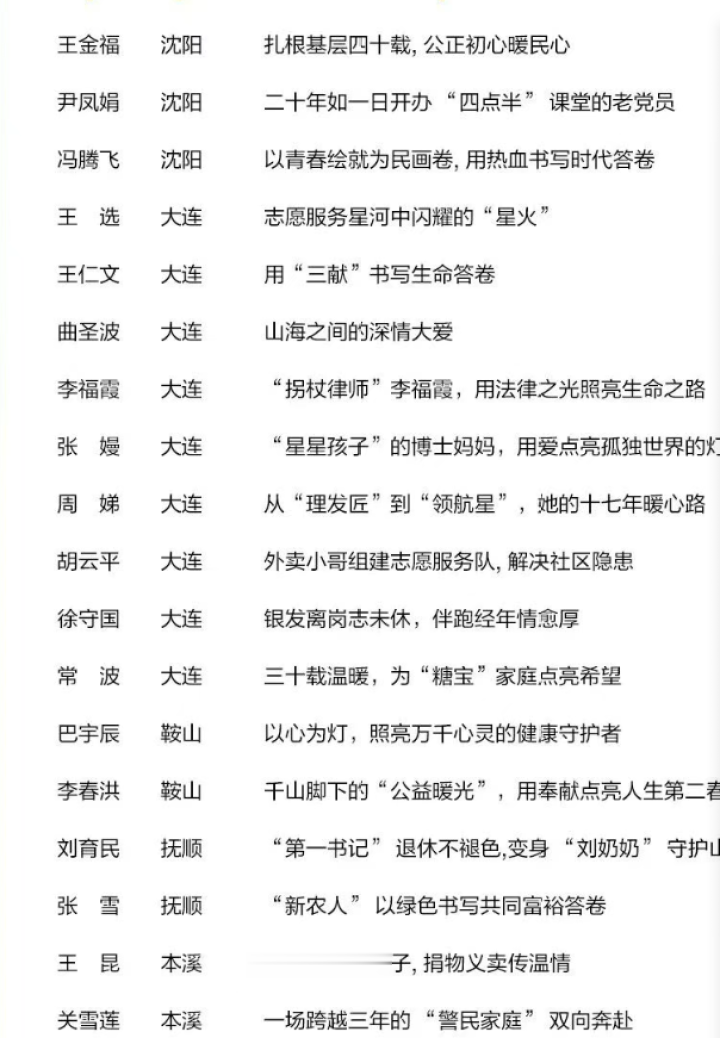 1月16日记者获悉,为培育和践行社会主义核心价值观,持续宣传选树凡人善举,弘扬中华传统美德,省精神文明办组织开展2025年度“辽宁好人”宣传选树活动。经各地组织推荐、资格审核、专家评审等程序,最终确定2025年度"辽宁好人"名单。鞍山6人入选。