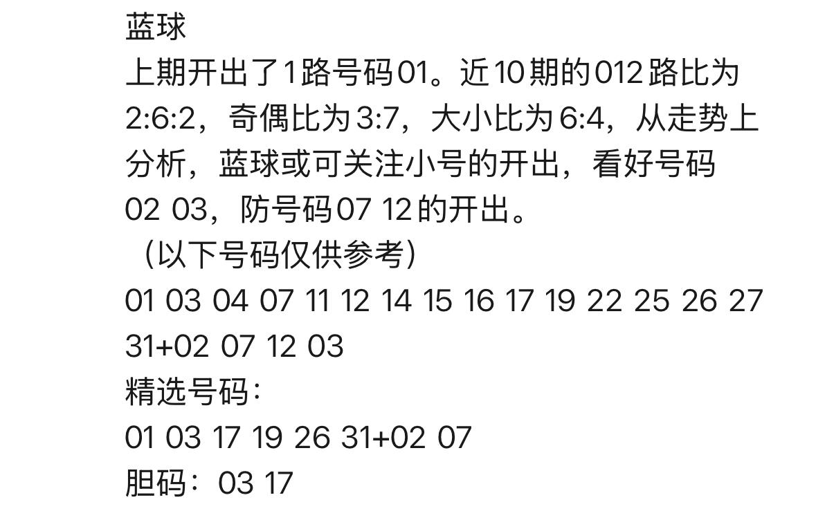 今夜双色球第26008期开奖在即,丹丹携幸运翩然而至。她从精心备好的“16+4”大底中,凝炼出一注“6+2”心水之选,其中玄机,颇有看点: 其一,红球之中,竟有三枚号码与昨晚大乐透开奖不期而遇——01、03、26,似有彩运相连之妙。 其二,与上期呈斜连之势者也有二位:26与31 其三,重号一枚,19再度现身 其四,奇偶格局竟与上期遥相呼应,仍为5奇1偶 其五,红球胆码尤为看重两枚奇数:03与17 其六,蓝球四码圈定02、03、07、12;再凝两码精粹:02与07 上期丹丹的红球大底曾中四元,今夜且看她能否再续慧眼,于新规落地之前,迎来一份惊喜如潮、璀璨如亿的幸运盛礼。