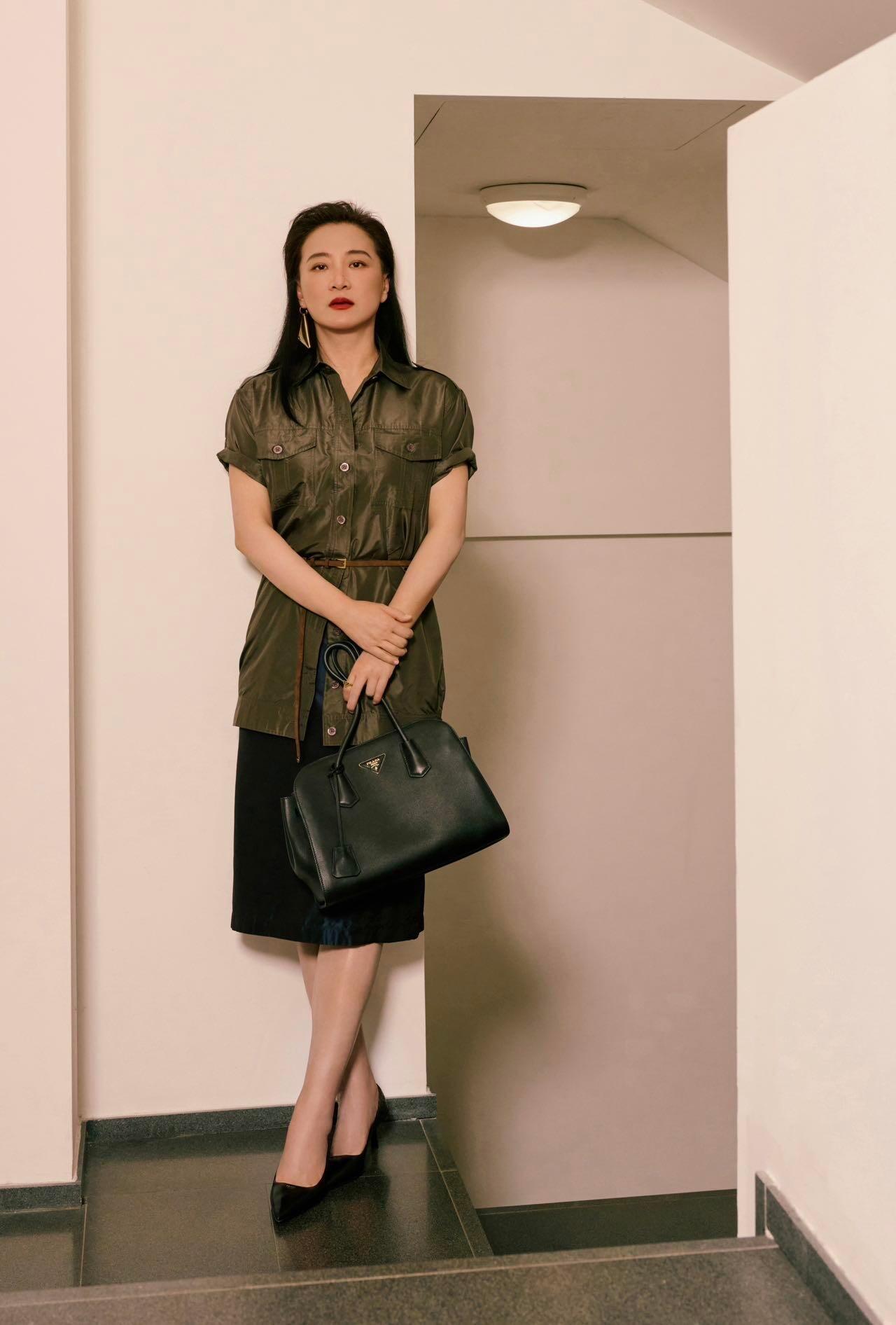 Prada大秀男装周米兰男装周贾玲米兰时装周Prada看秀,橄榄绿衬衫搭配半身裙