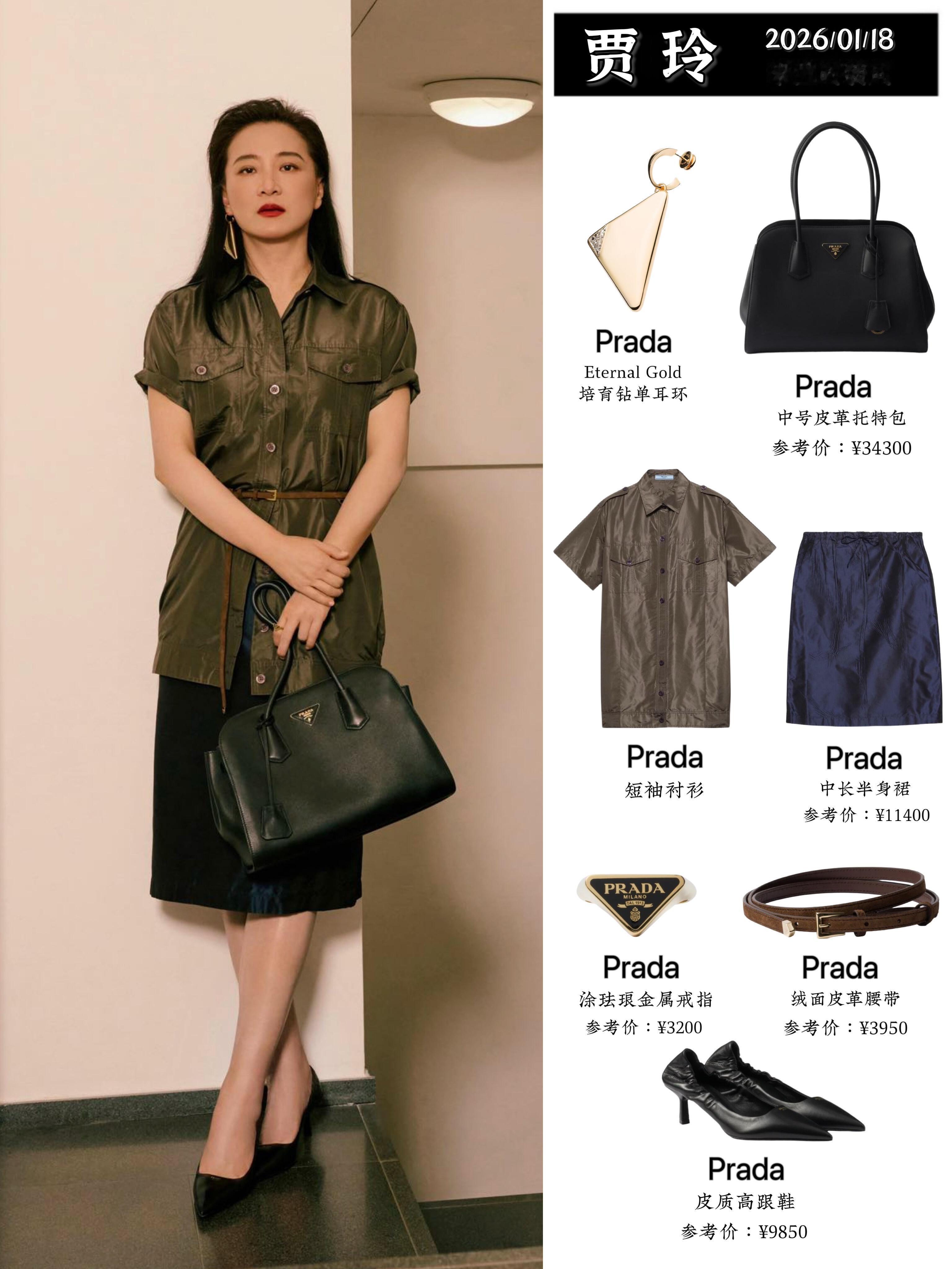 Prada大秀男装周米兰男装周贾玲米兰时装周Prada看秀,橄榄绿衬衫搭配半身裙、皮质腰带利落优雅,全套Prada单品质感拉满。