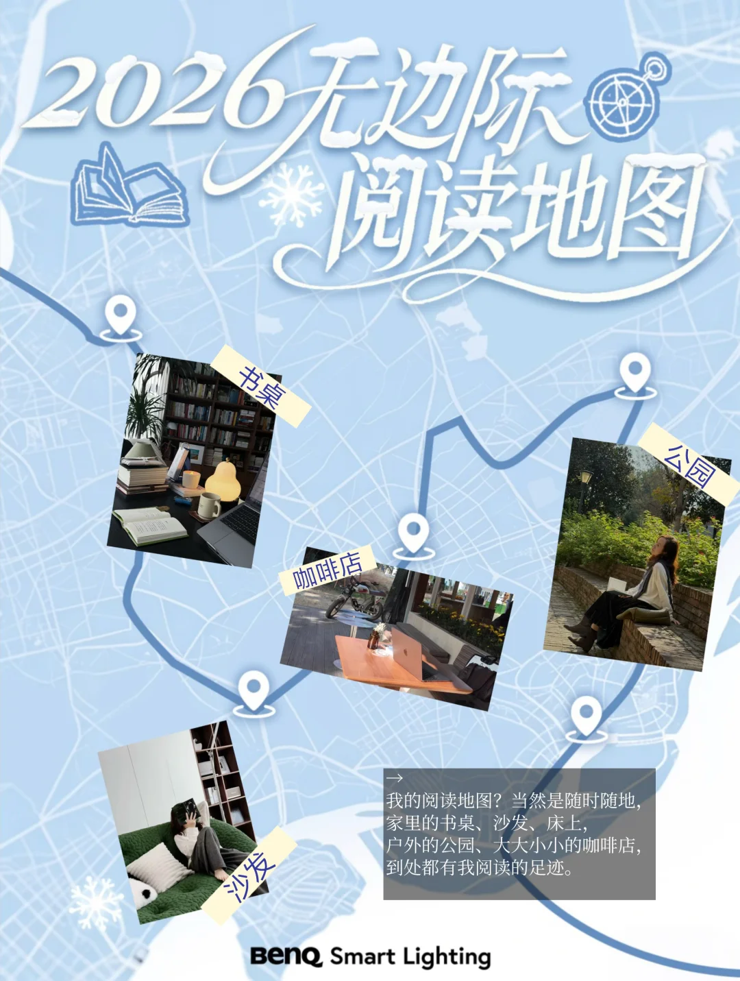 我的阅读地图?当然是随时随地。家里的书桌、沙发、床上,户外的公园、大大小小的咖啡店,到处都有我阅读的足迹。
