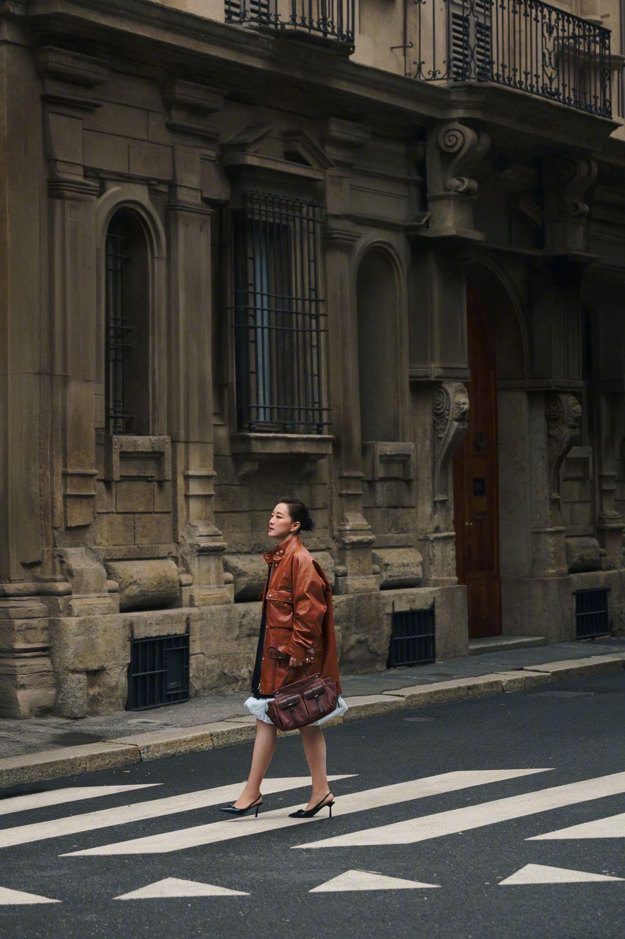 Prada大秀男装周米兰男装周贾玲 × Prada 2026秋冬大秀焦糖色皮质风衣内搭黑裙,混搭出松弛高级感,米兰街头与花市的氛围感大片,时尚表现力🔝。