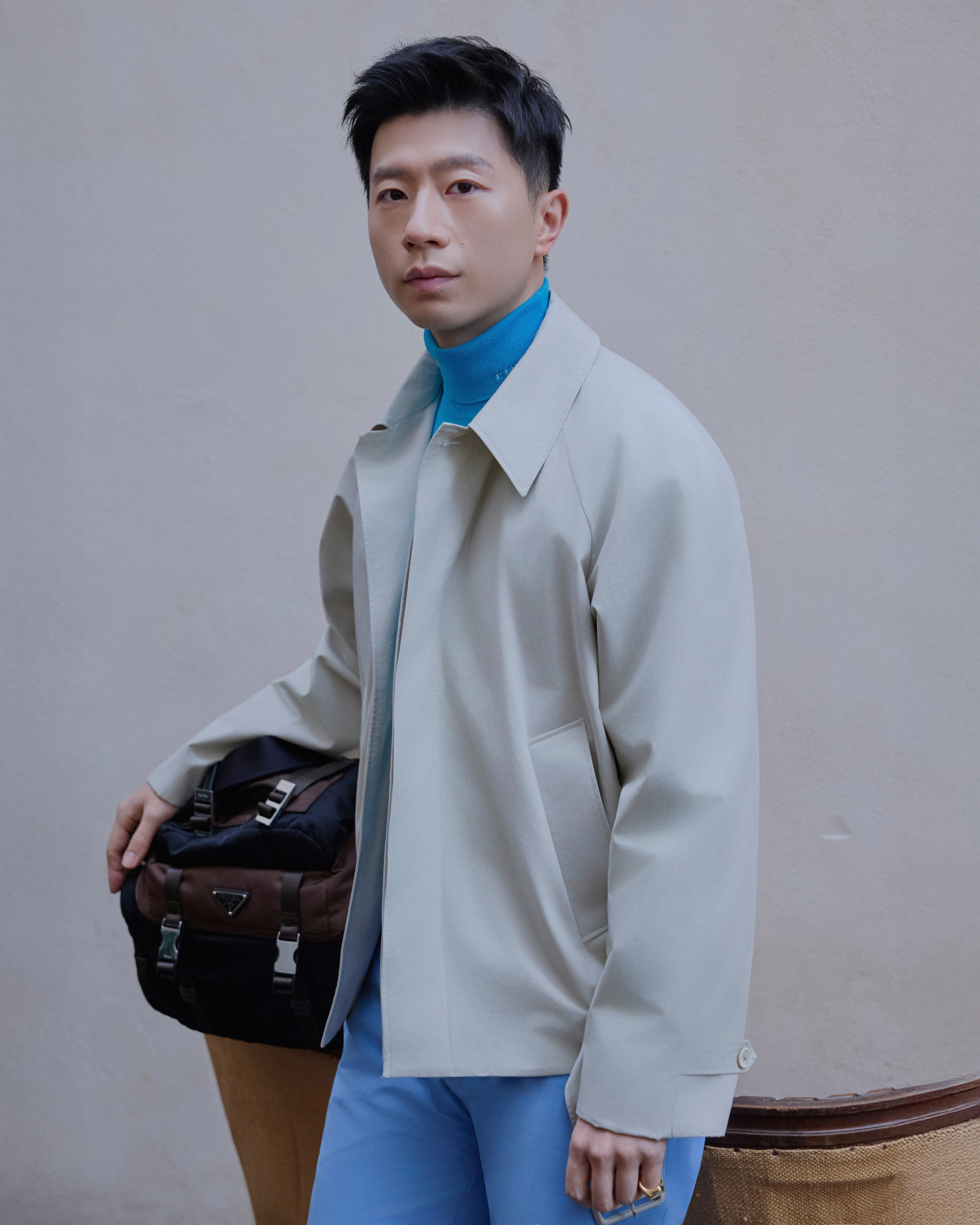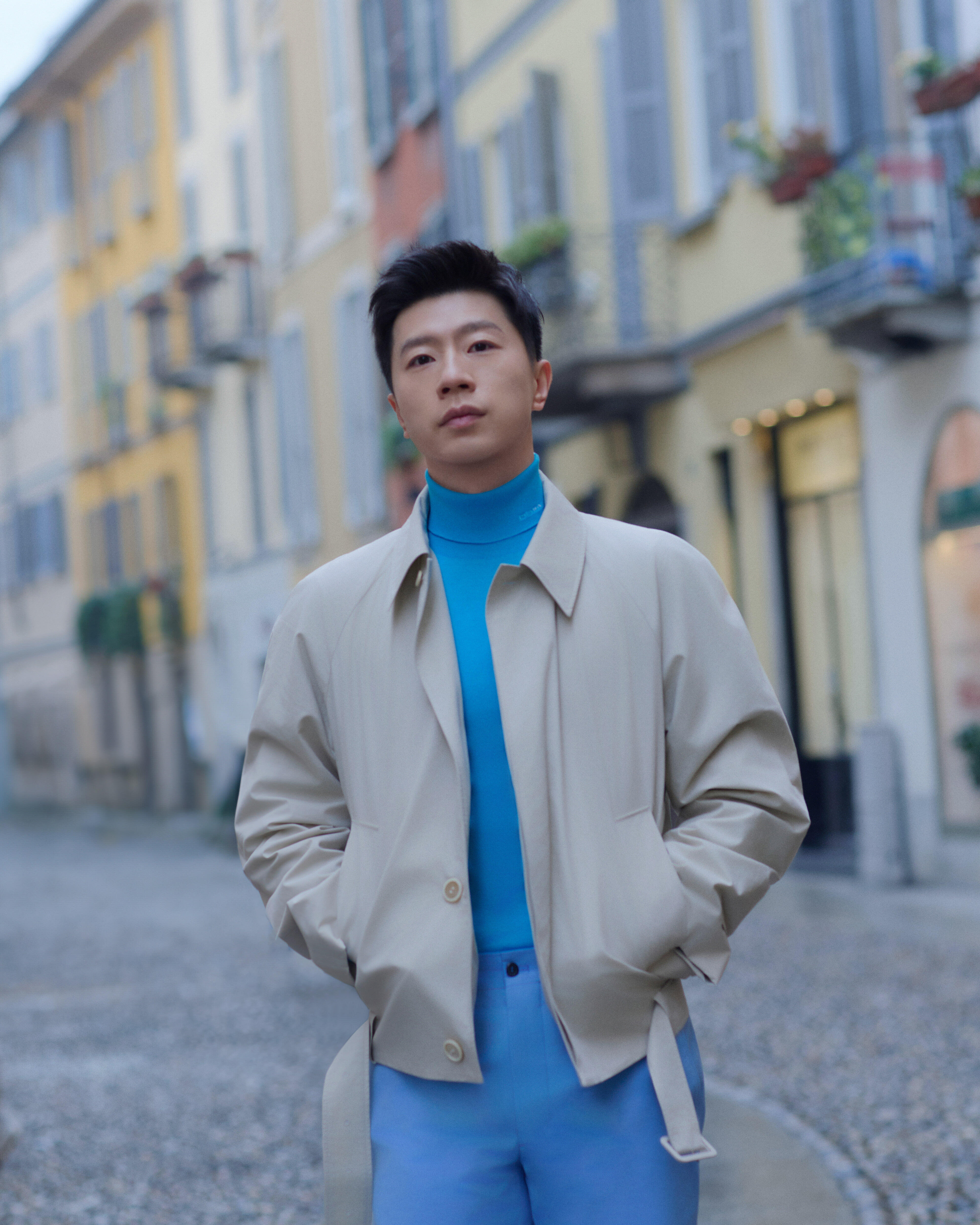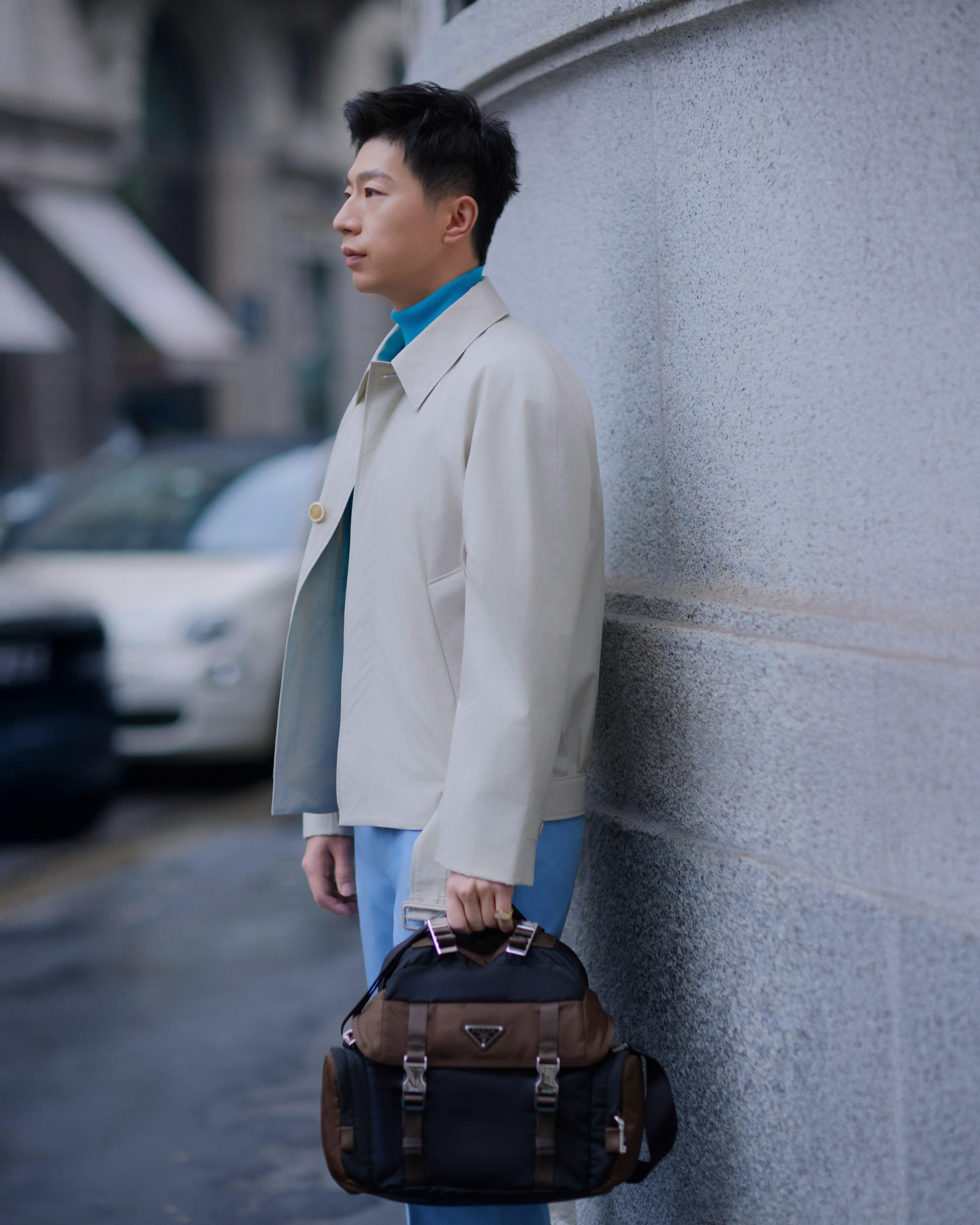 Prada大秀男装周米兰男装周马龙 ×Prada 2026秋冬大秀马龙穿着Prada2026春夏系列,浅米色外套搭亮蓝高领衫清新高级,漫步米兰街头,松弛感、贵气感兼具。