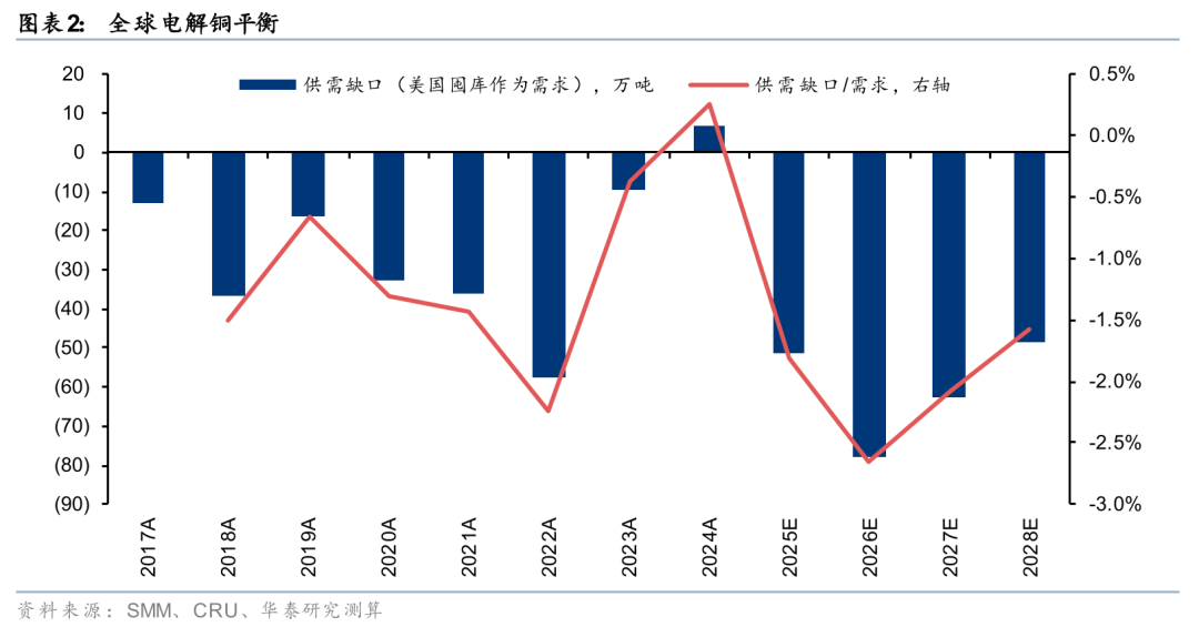 26年,我们预期全球电解铜供给仍有限,同比增量66万吨/增速2.4%;全球电解铜需求由美国囤库及电网建设驱动,同比增量93万吨/增速3.3%;因此供需或从过剩转为短缺,叠加海外通胀、流动性边际宽松等因素,铜价中枢或同比显著抬升。中长期来看,全球技术进步叠加海外制造业复苏,多周期共振下26-28年电解铜需求或保持高增;而供给约束性较强(铜矿扰动频繁、资源稀缺、对价格反应滞后),我们预测全球供需保持短缺,26-28年分别短缺78/63/49万吨(25年过剩52万吨),该期间铜价有望冲击$15000/t以上。