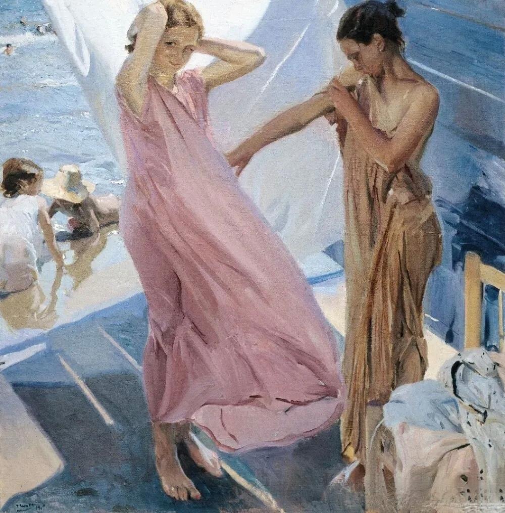 海边漫步,白裙飘飘,阳光洒满沙滩,狗儿相随,享受美好时光。