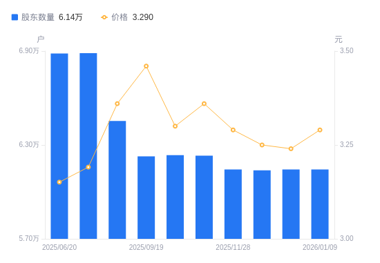 日期A股户数(户)流通A股户均持股数(股)户均持股市值(万元)2026-01-0961433122809.1040.402025-12-3161433122809.1039.792025-12-1961378122919.1539.952025-11-2861437122801.1040.402025-10-3162316121068.9340.682025-09-3062349121004.8539.932025-09-1962276121146.6941.922025-08-2064534116907.8539.282025-06-3068873109542.6634.962025-06-2068851109577.6634.53