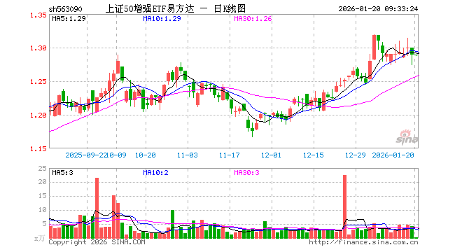 1月20日,上证50增强ETF易方达(563090)开盘涨0.00%,报1.289元。上证50增强ETF易方达(563090)重仓股方面,贵州茅台开盘涨0.25%,中国平安涨0.08%,药明康德跌0.50%,海尔智家涨0.00%,深南电路跌0.04%,澜起科技跌0.68%,沪电股份跌0.53%,紫金矿业涨0.00%,豪威集团涨0.14%,国泰海通跌0.05%。